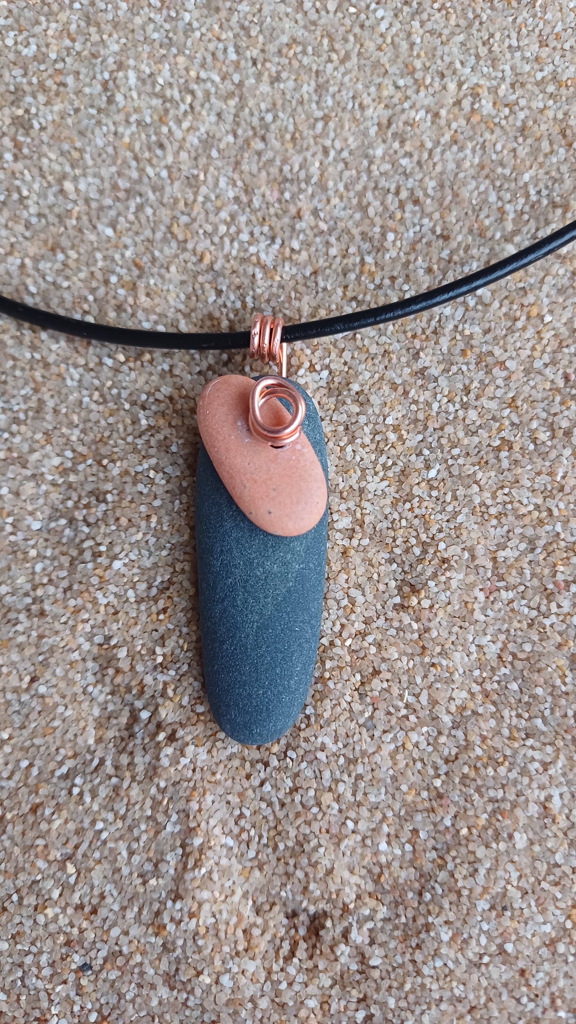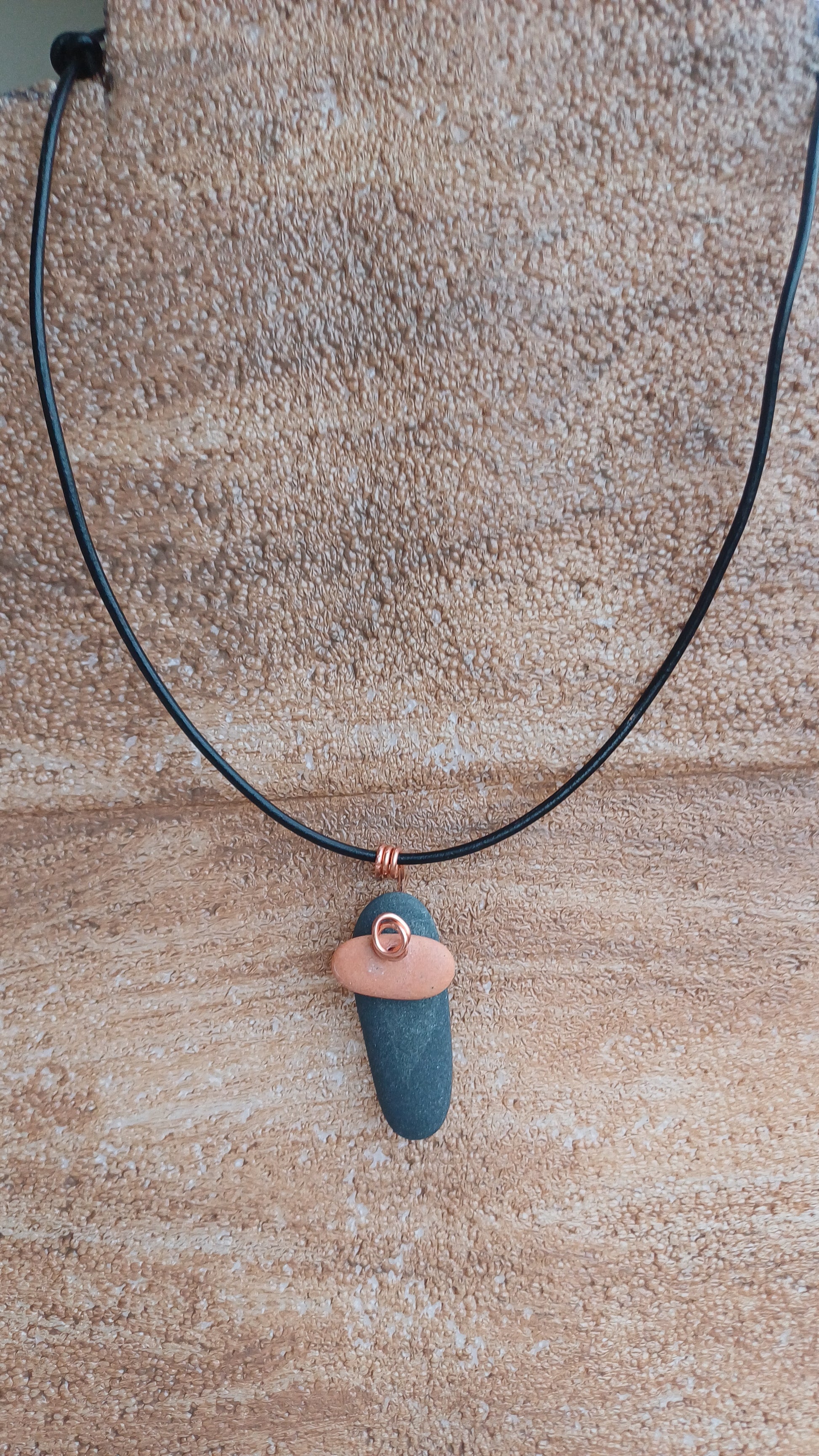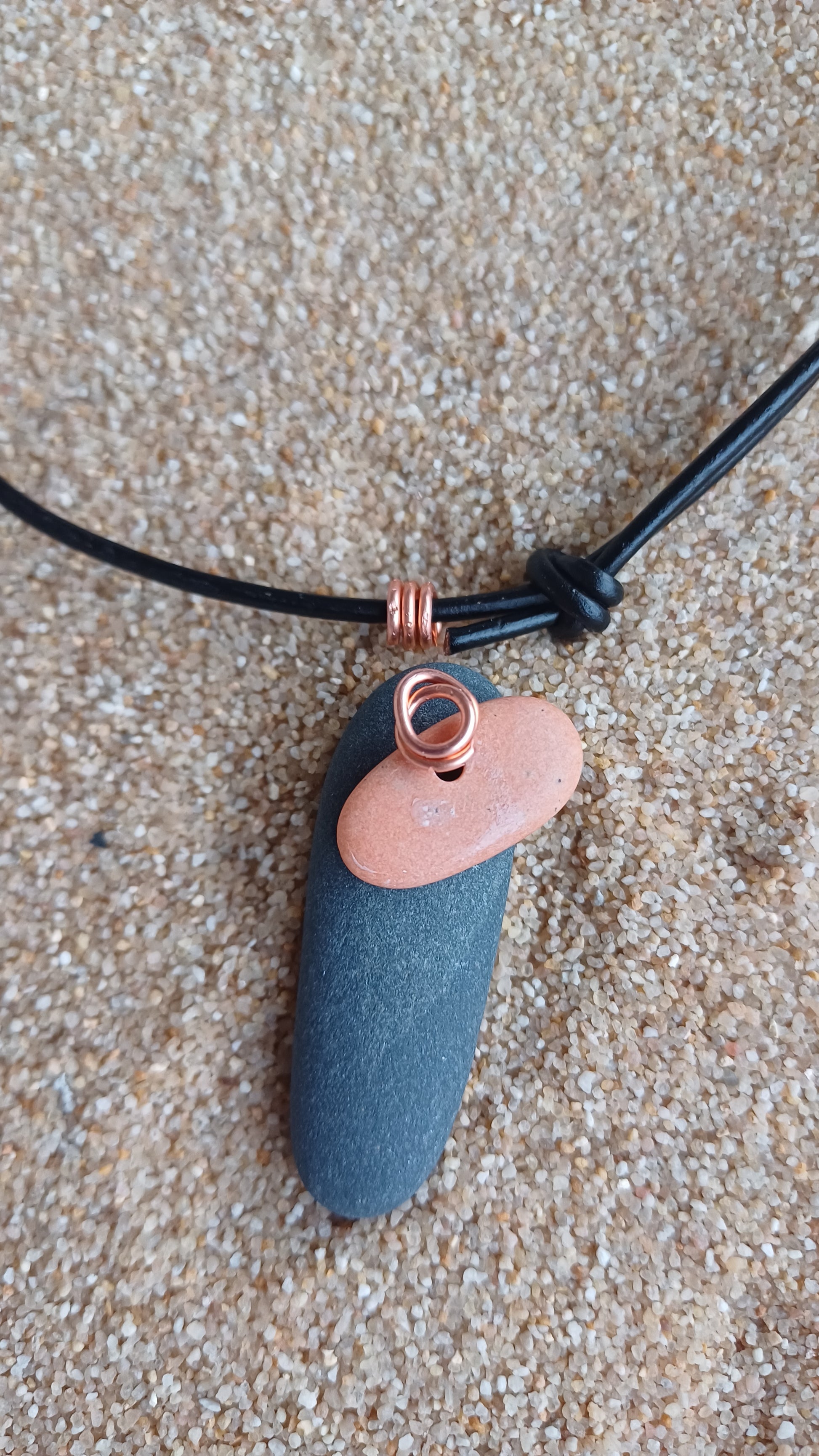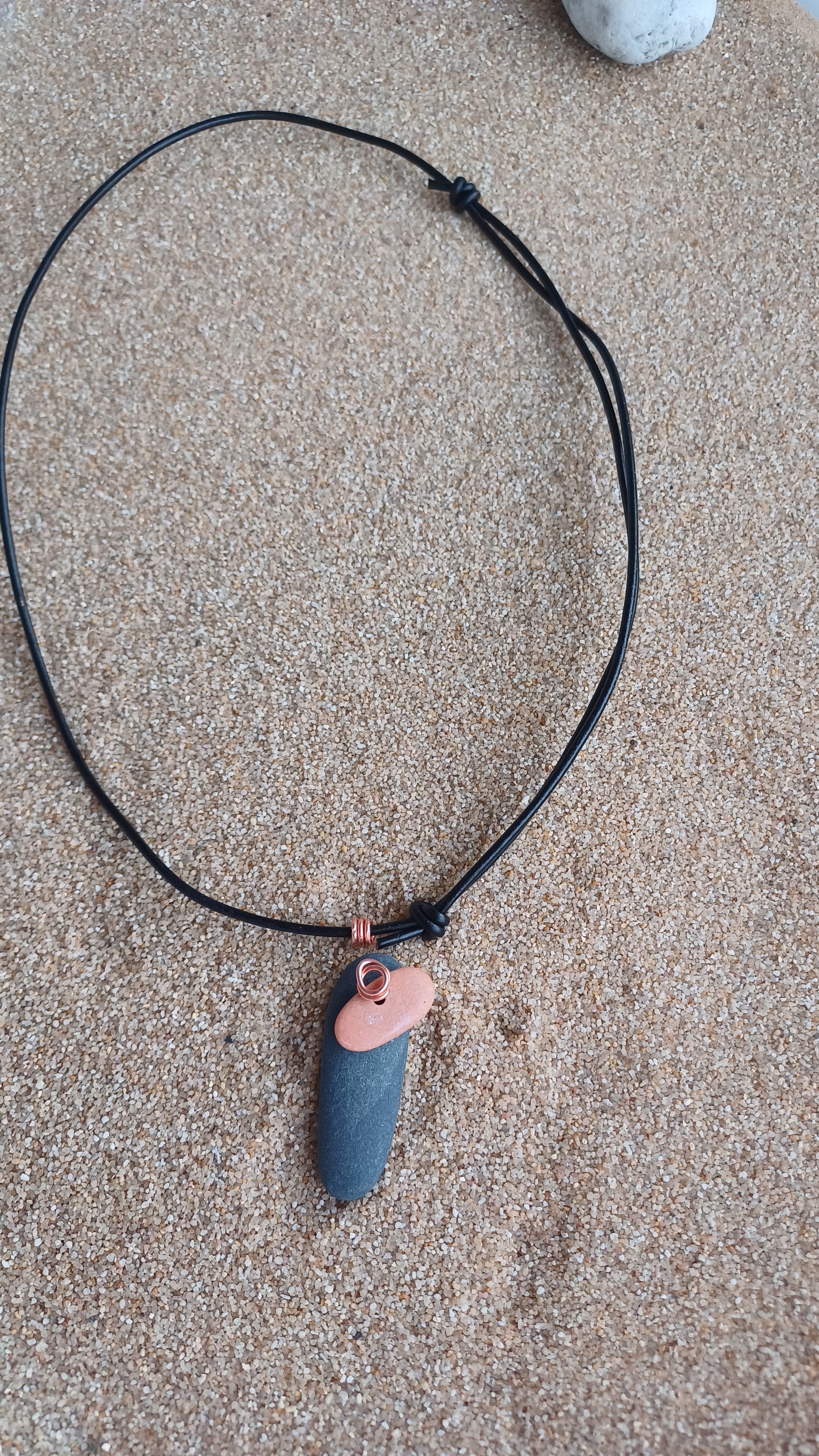 -40mm beach stones. x 15 mm and copper with movement on a 66cm leather rope. adjustable