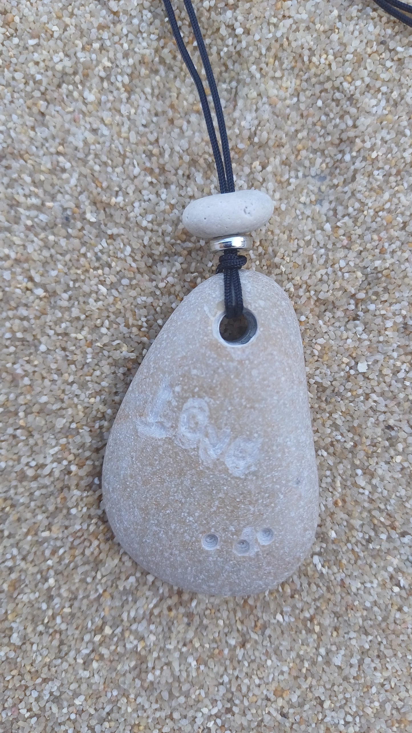 -Piedra de playa 47mm x 32mm con gravado "love" y cuerda adjustable de 66cm.