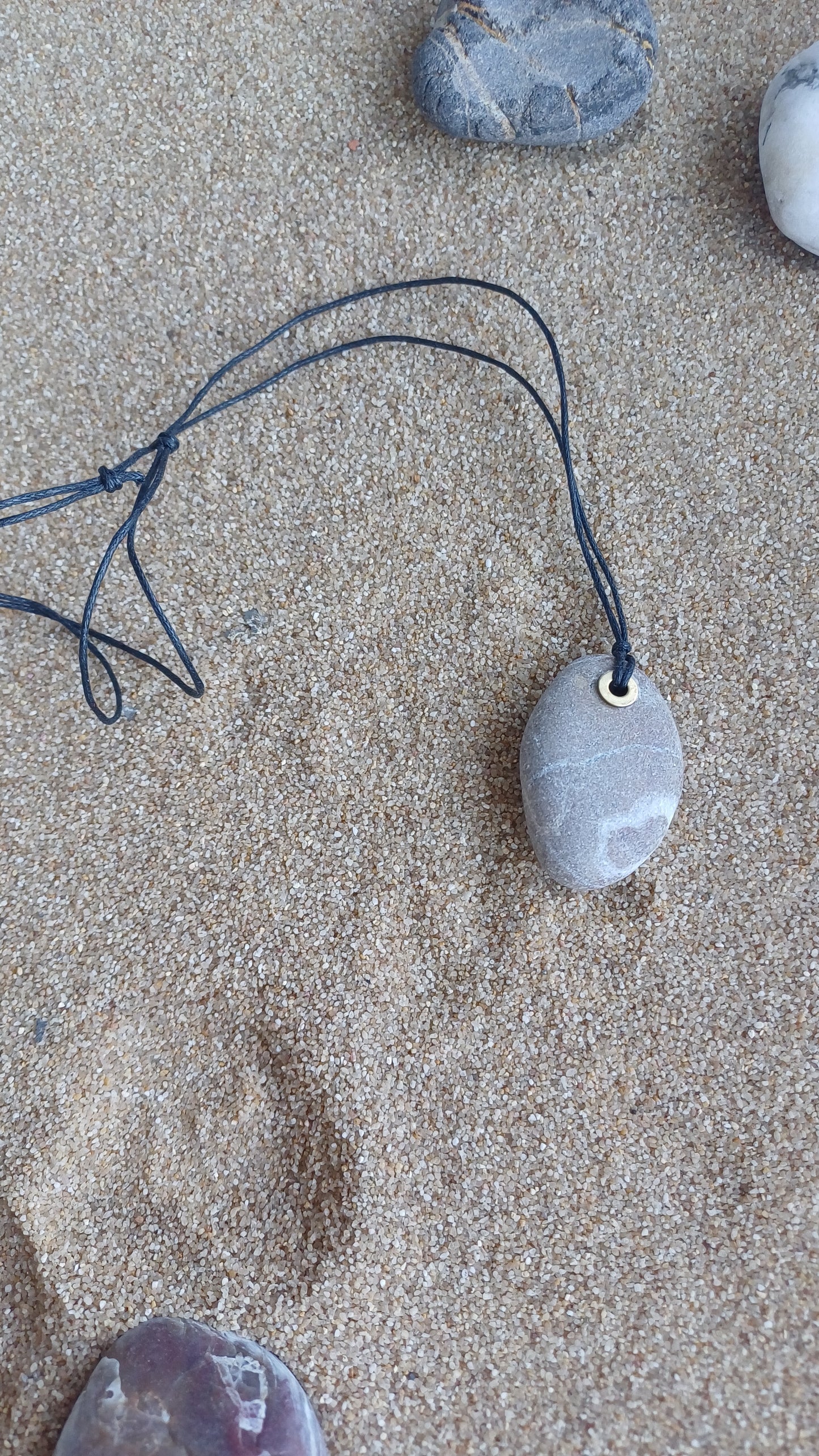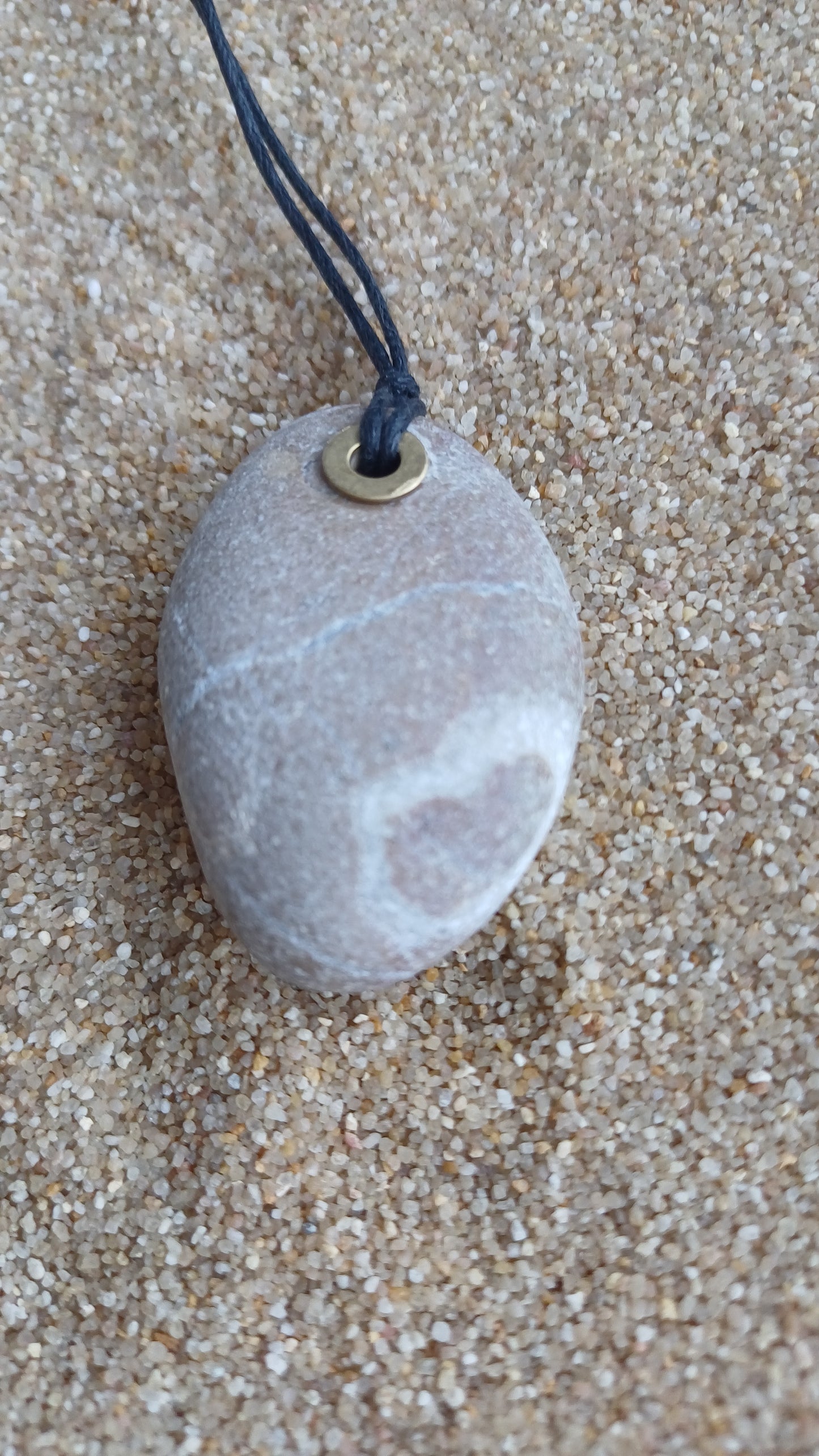 -43mm x 28mm beach stone with natural heart and brass on a 66cm adjustable rope.