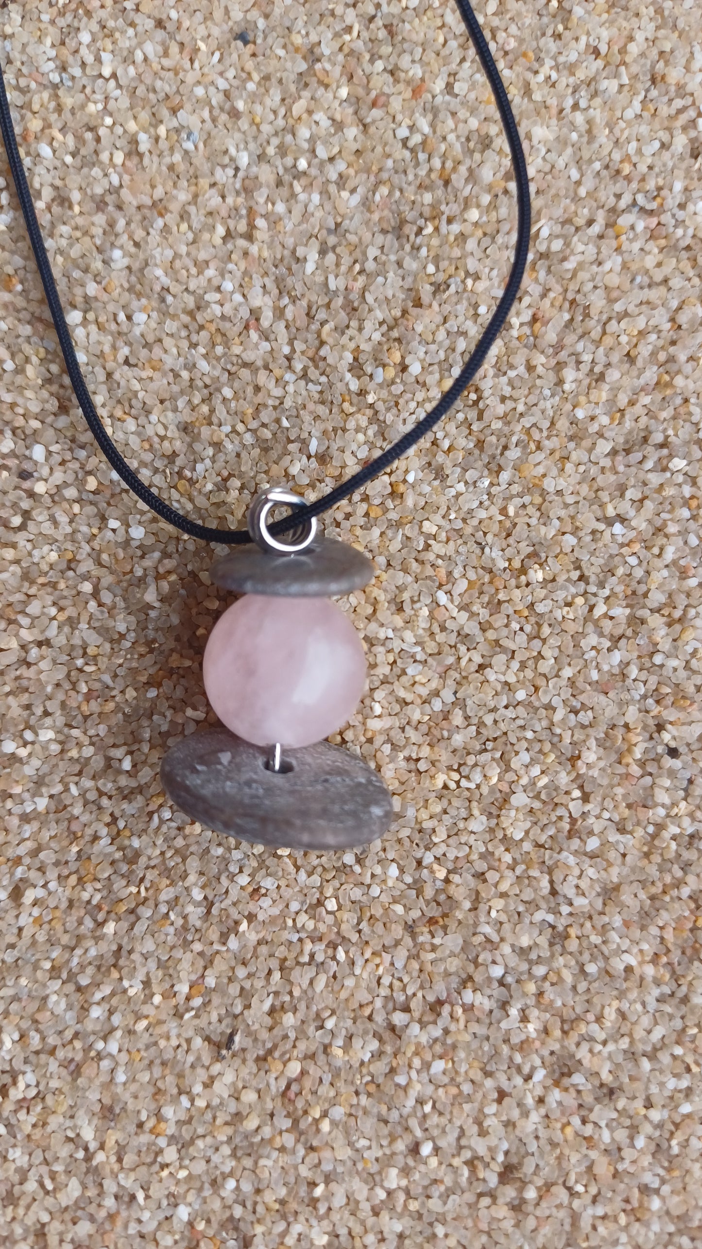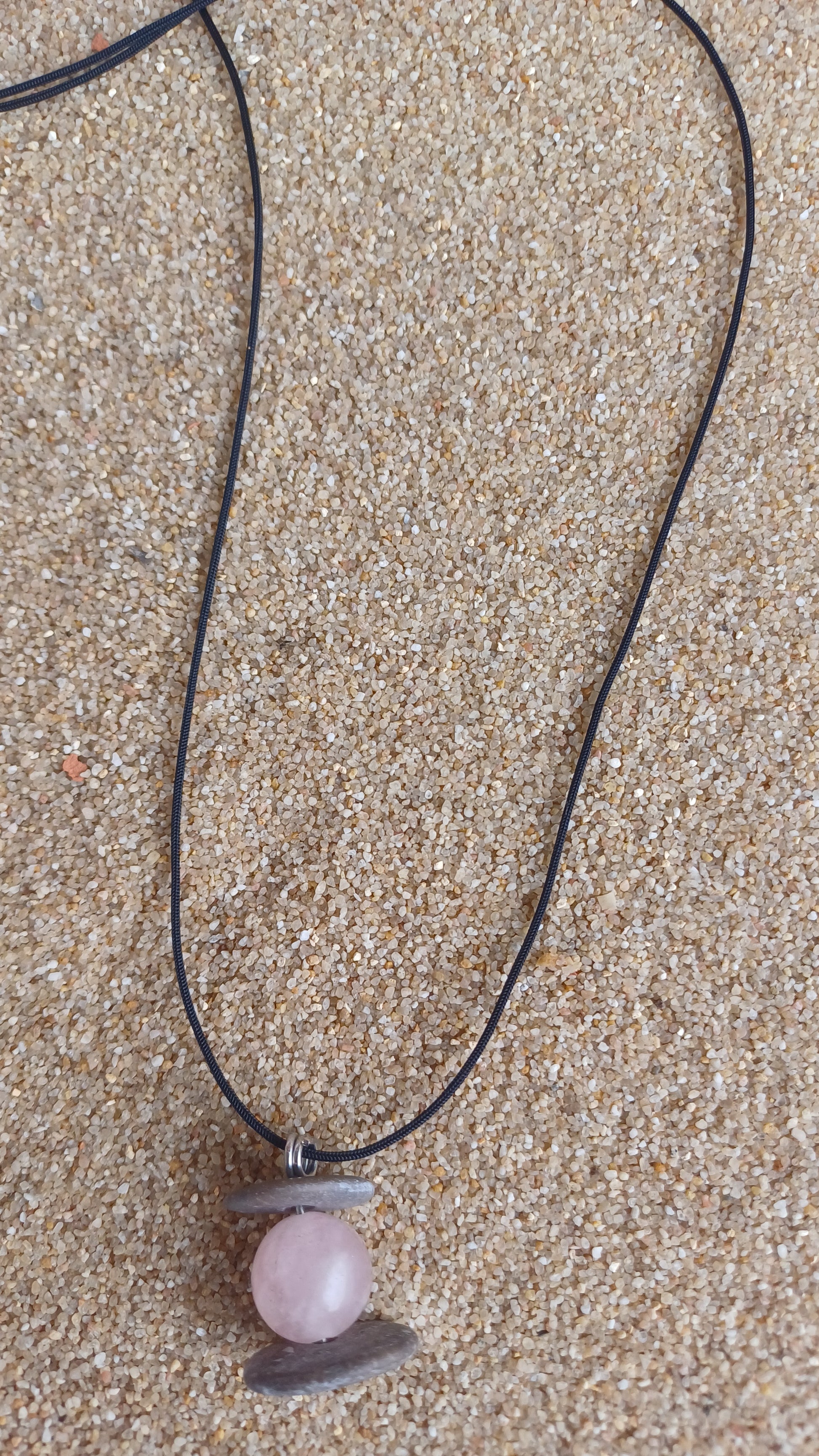 - Necklace with 2 beach stones and a rose quartz on a 66cm adjustable rope.