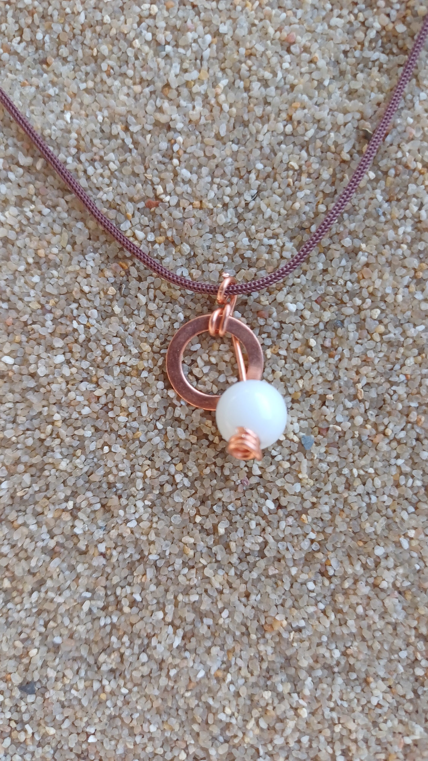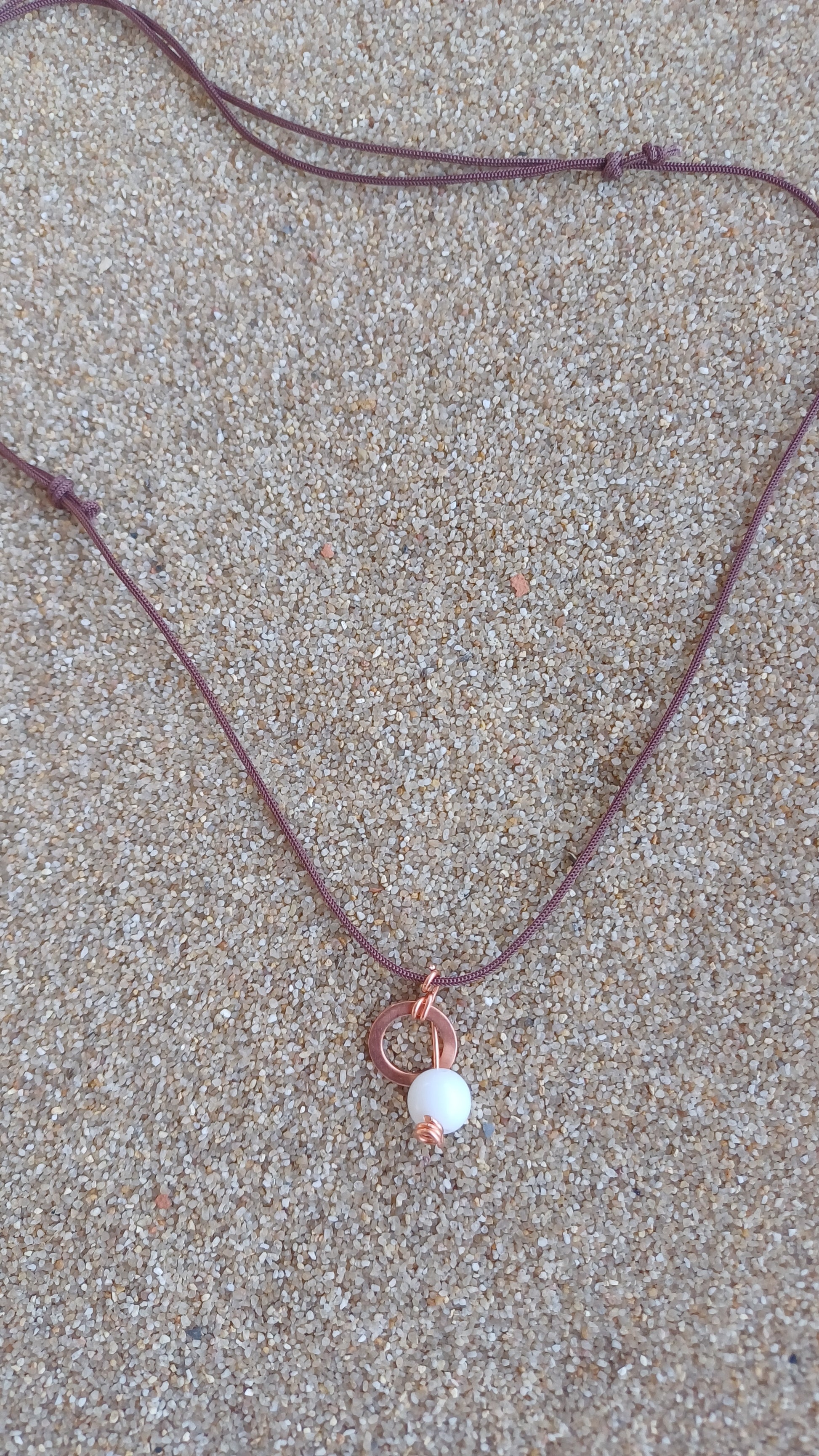 -Necklace with copper and white jade hoop on 66cm adjustable rope.