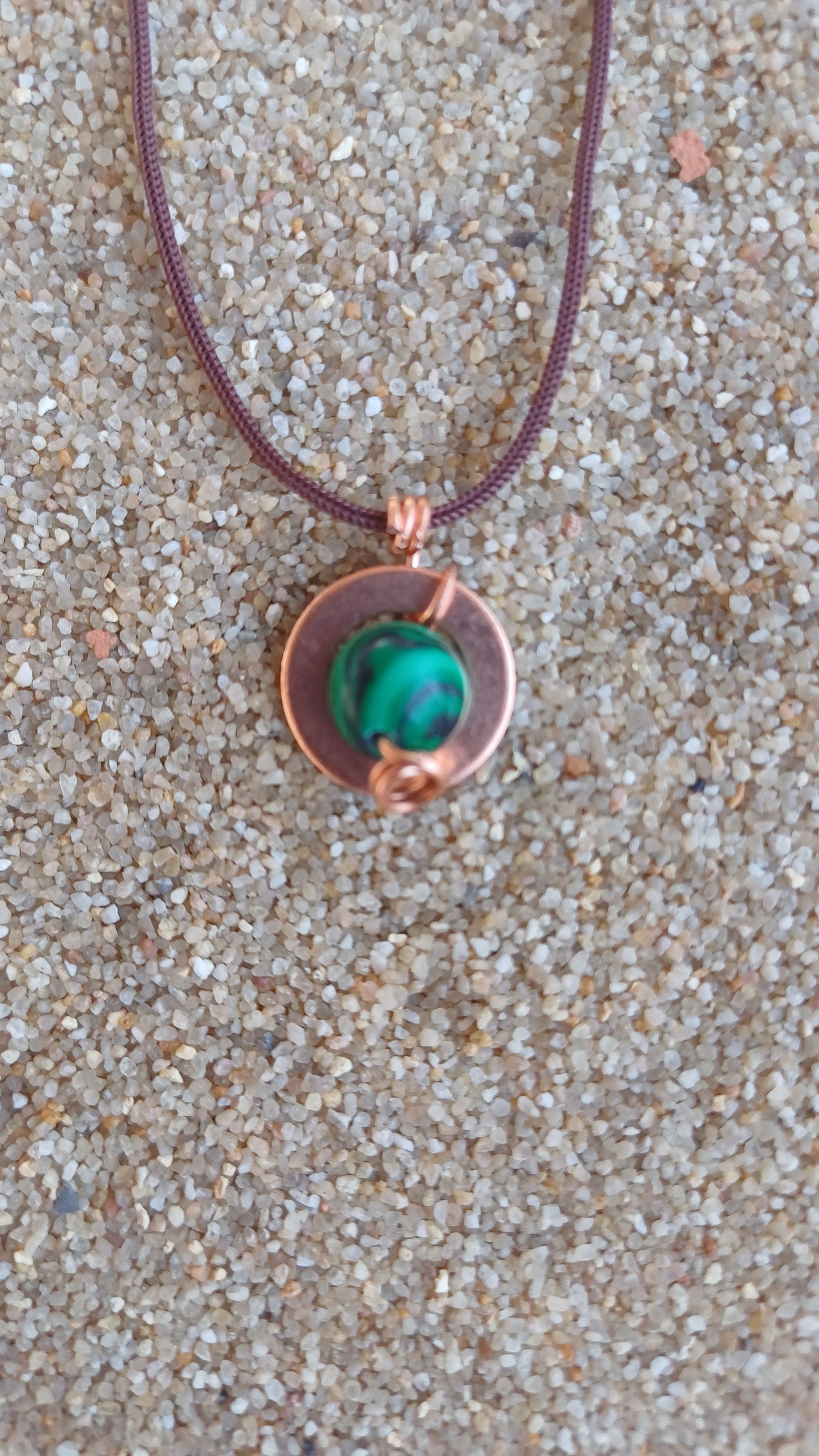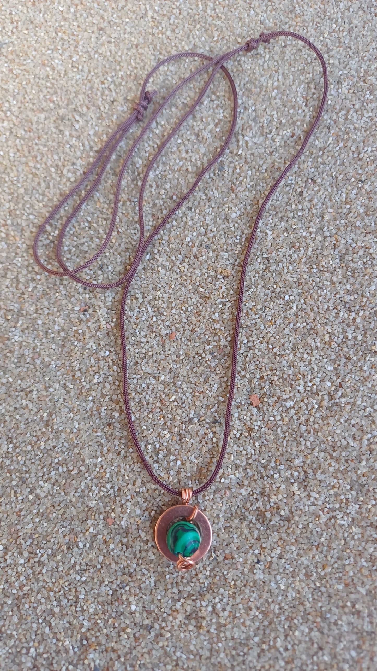 -Necklace with copper and malachite hoop on 66cm adjustable rope.