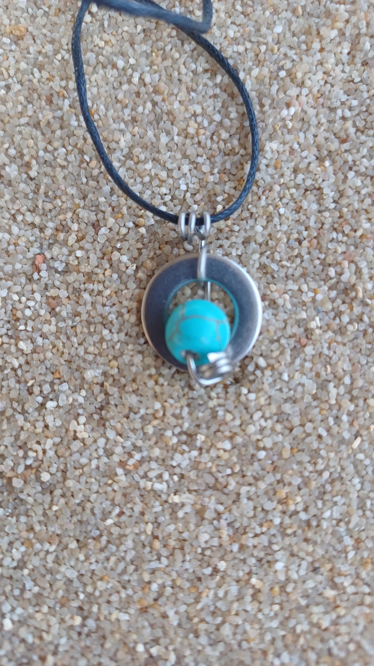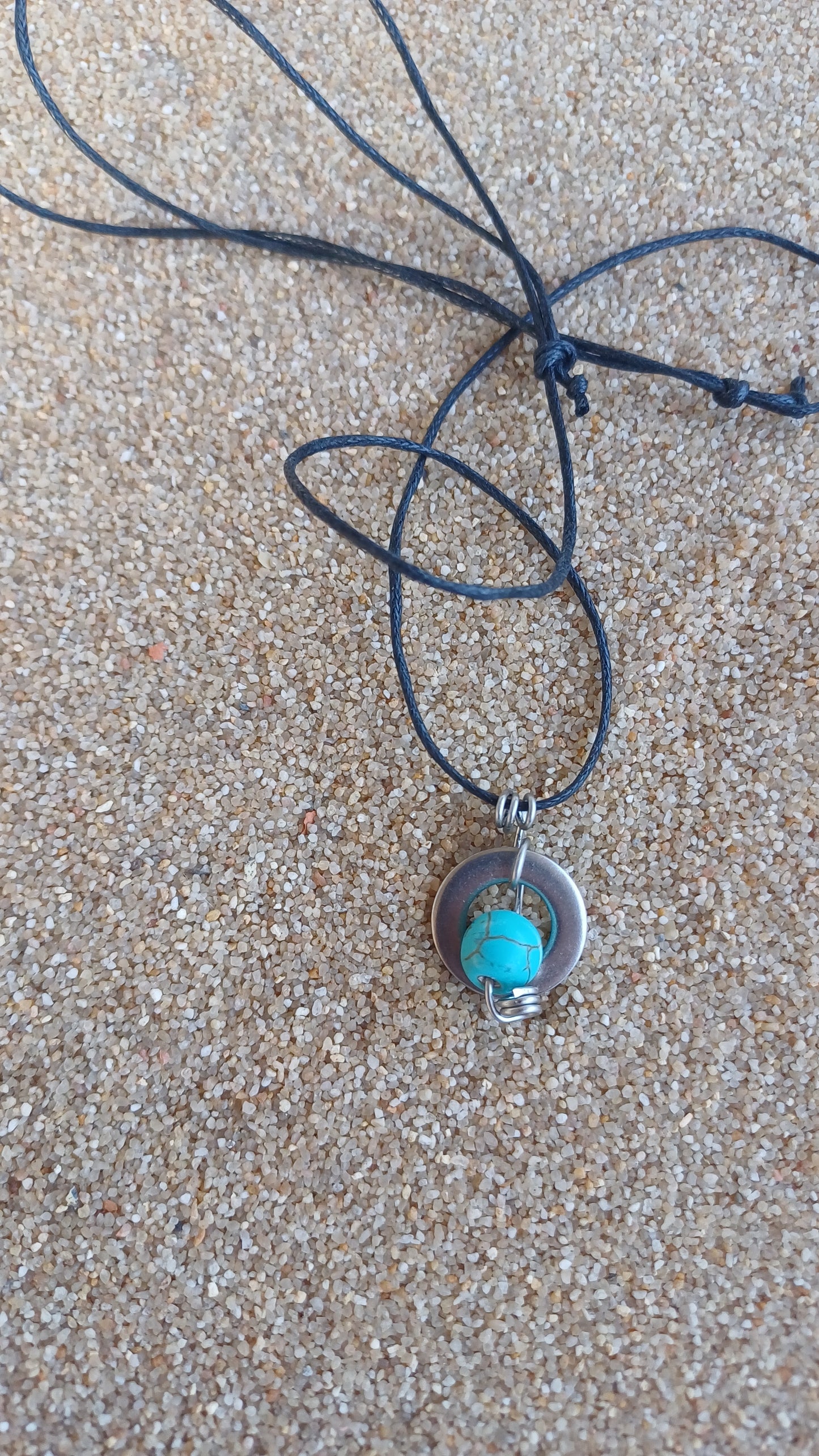 -Necklace with stainless steel and turquoise ring on 66cm adjustable rope.