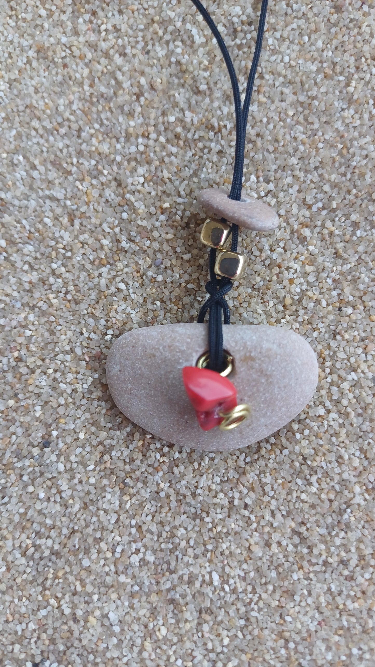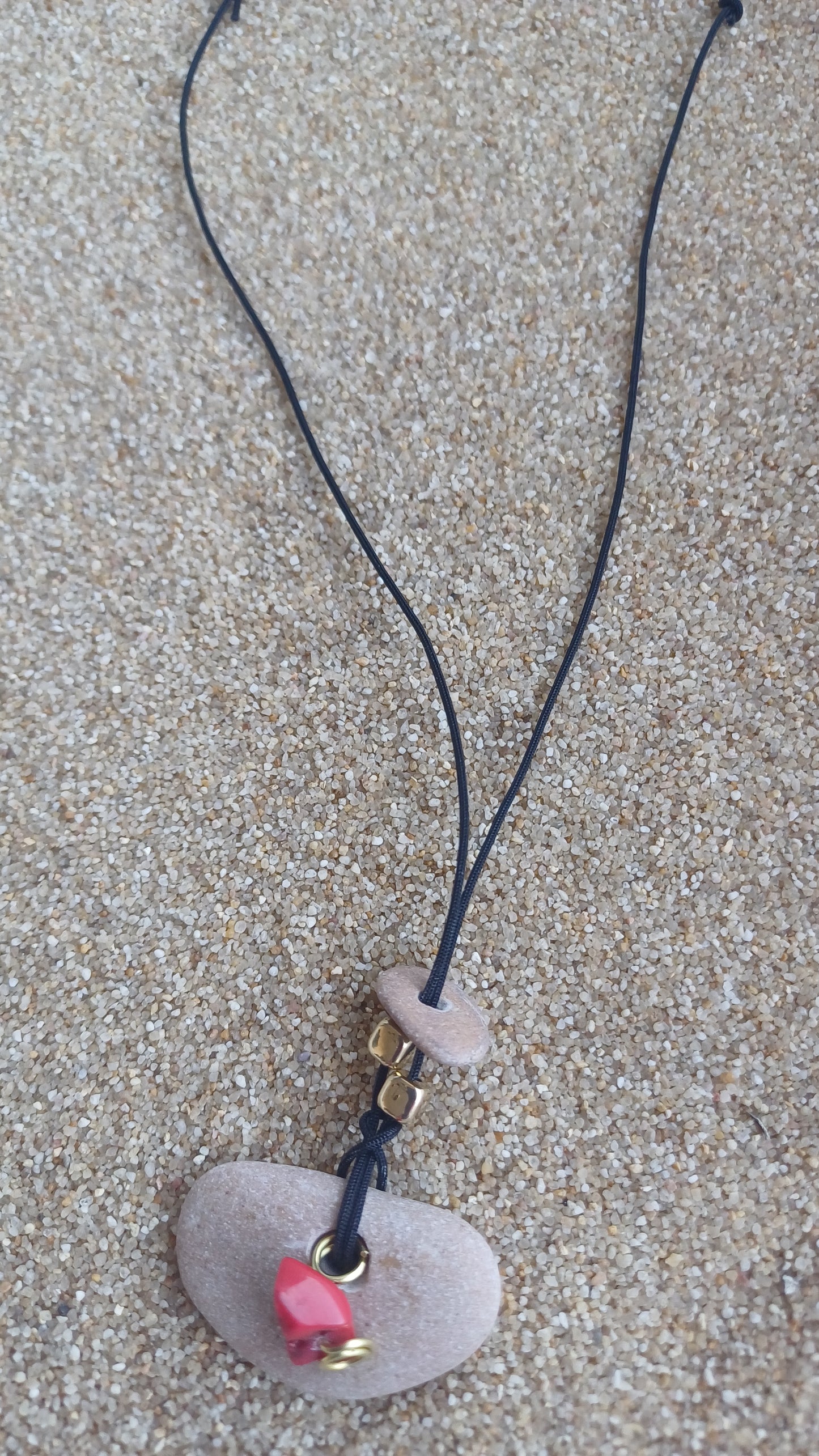 -Necklace with 2 30mm x 20mm beach stones and red jade on a 66cm adjustable rope.