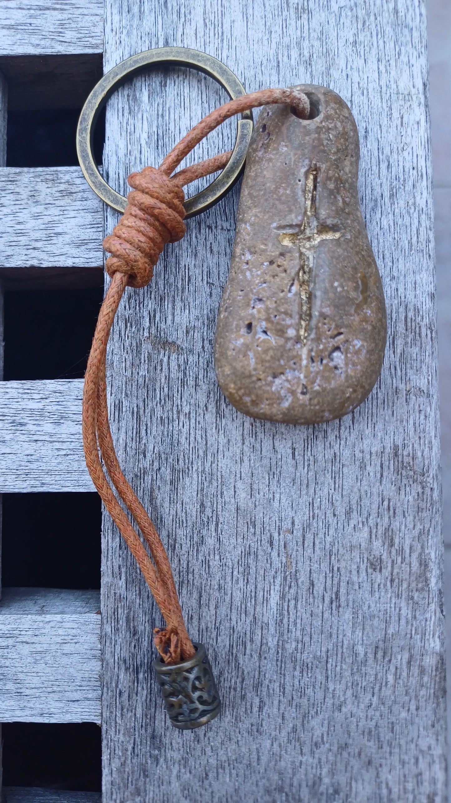 -60mm x 30mm stone keychain with hand-engraved cross and gold leaf.