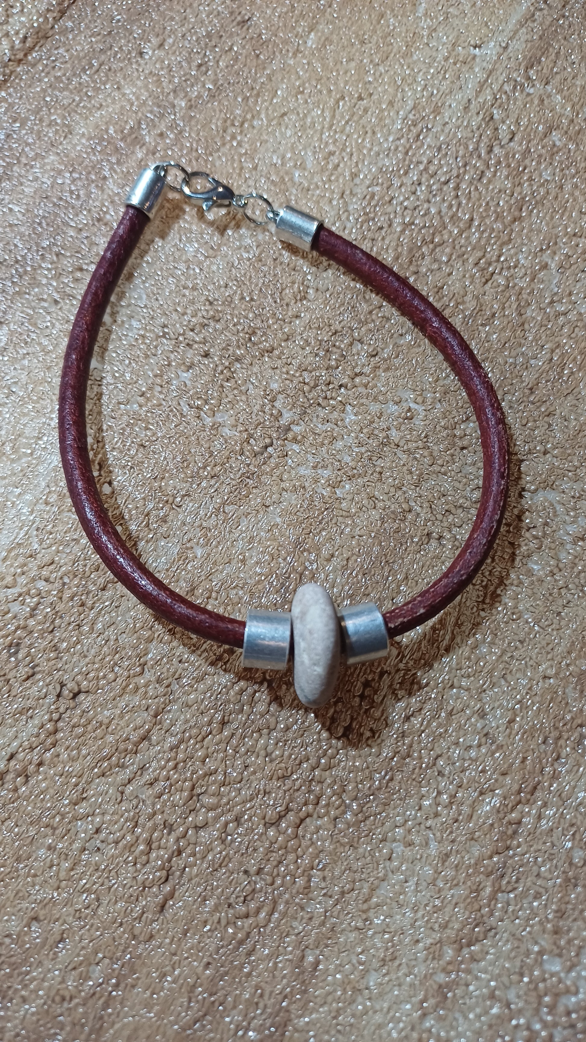 -Maroon leather bracelet with beach stone and stainless steel 23 cm.