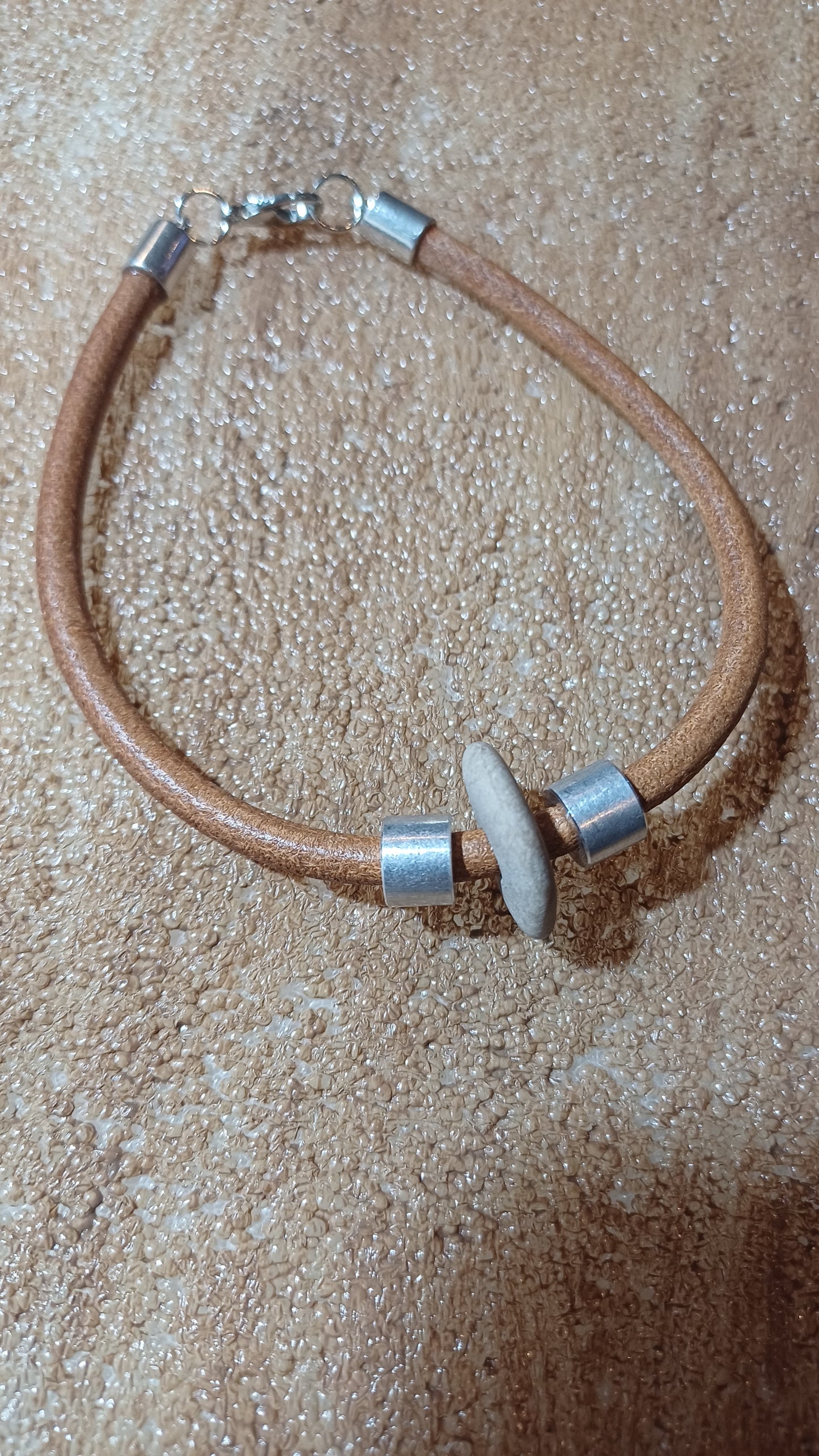-Caramel-colored leather bracelet with beach stone and stainless steel 23 cm.