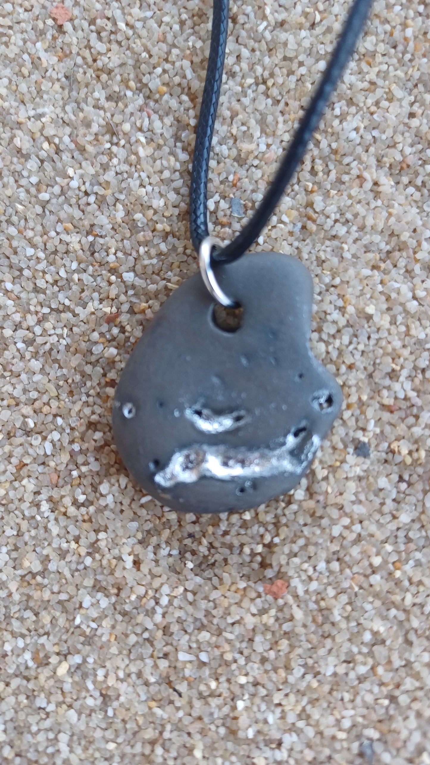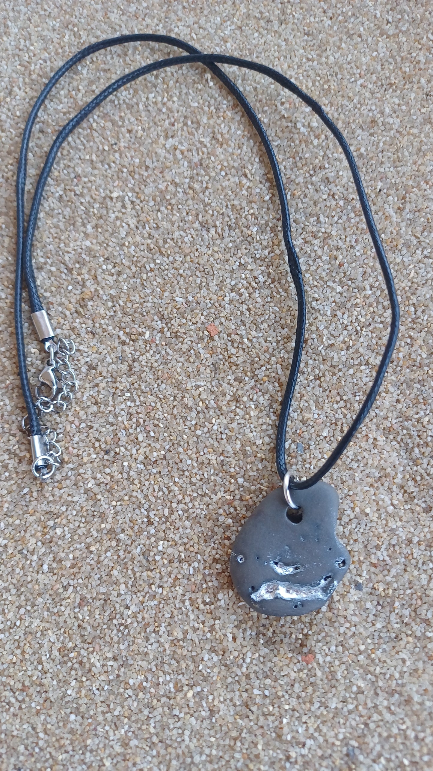 -Beach stone with 30mm x 25mm silver leaf on a 52 cm stainless steel chain with clasp.
