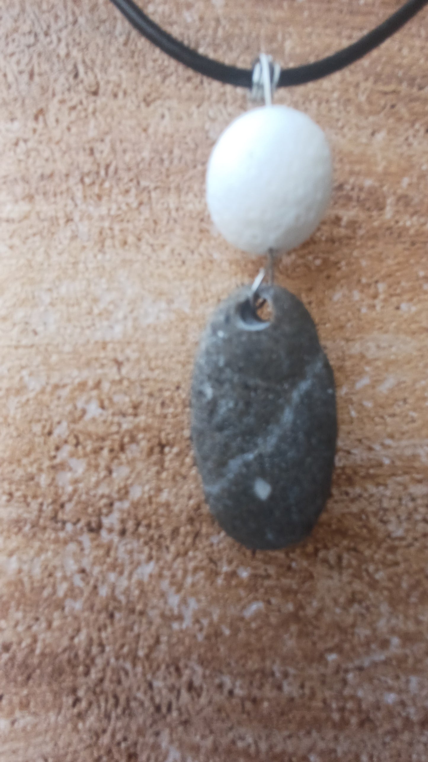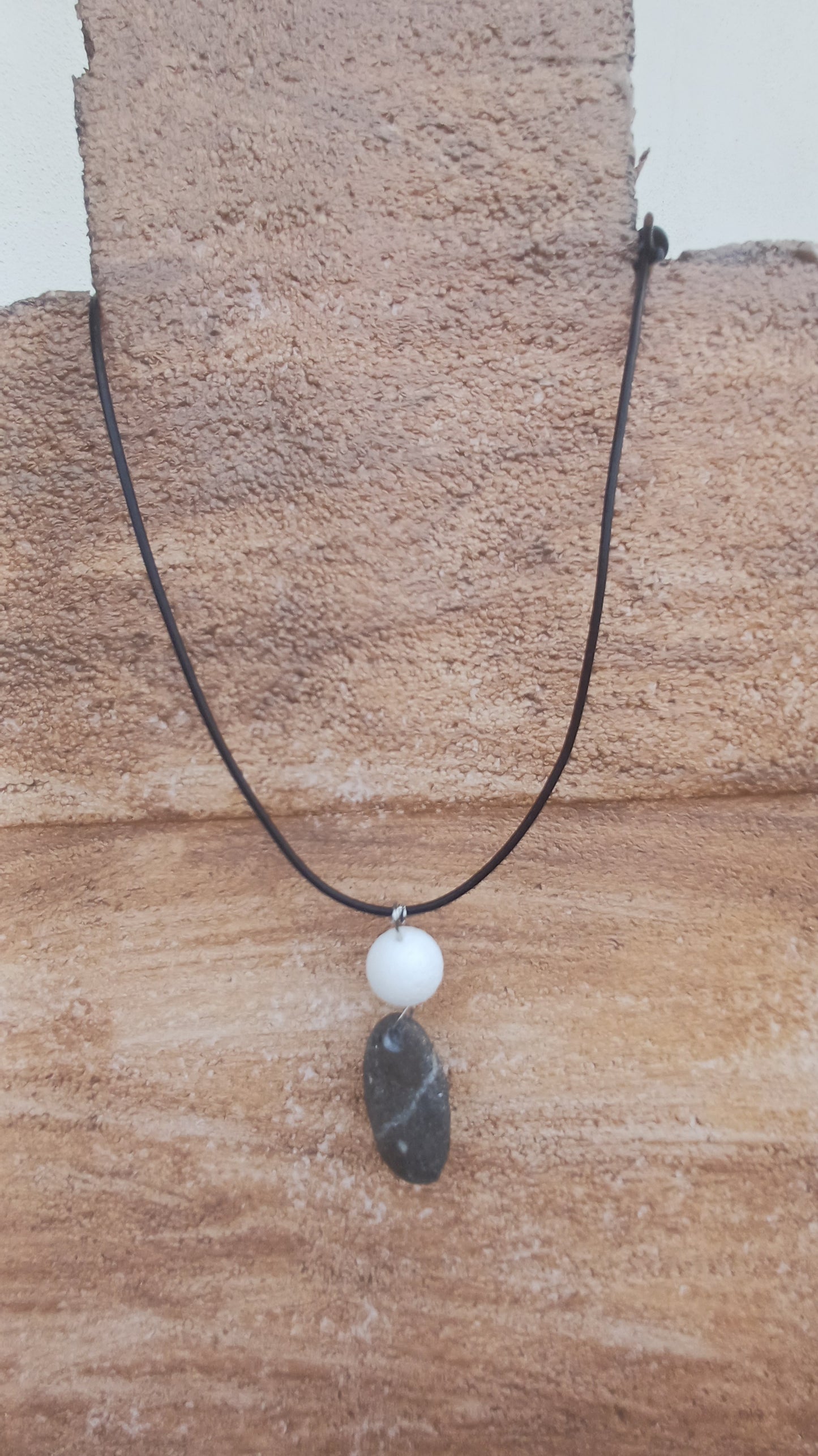 -Collar de cuero 70 cm. ajustable con piedra de playa y bola blanca de roca volcánica 55mm x 22mm.