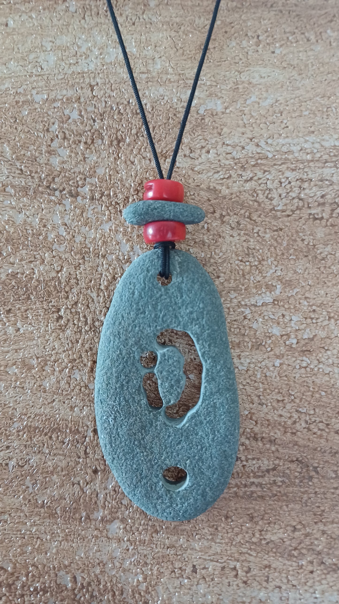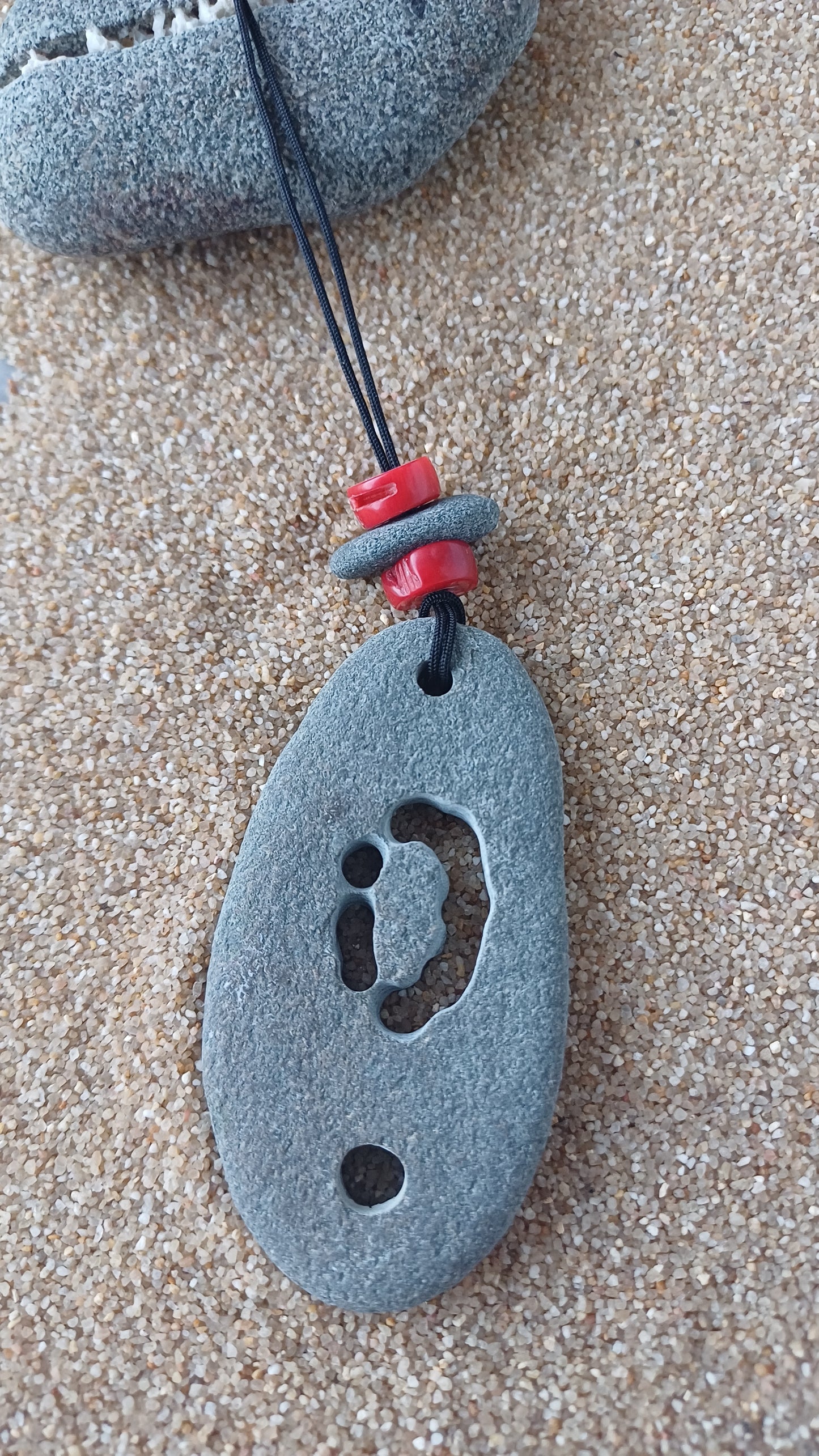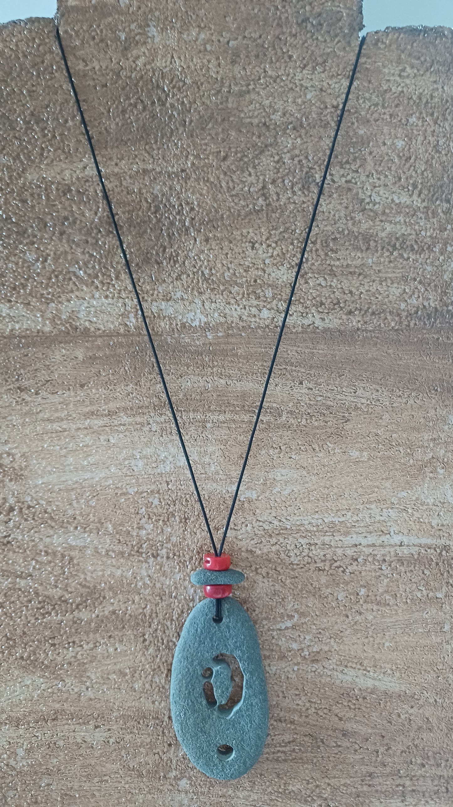 -Necklace made of beach stones and red coral 80 mm x 37 mm, hand-carved and with an 82 cm adjustable rope.