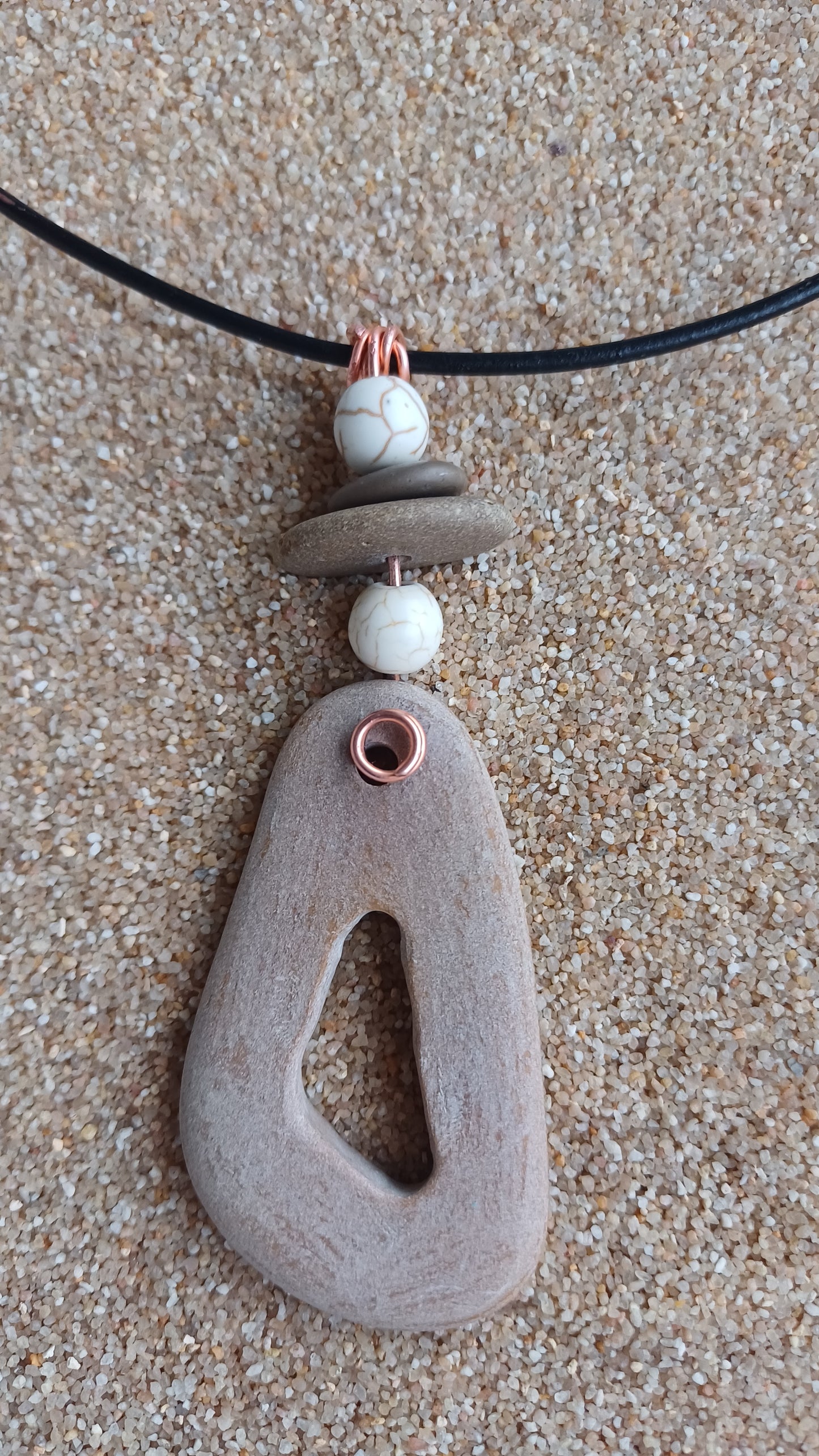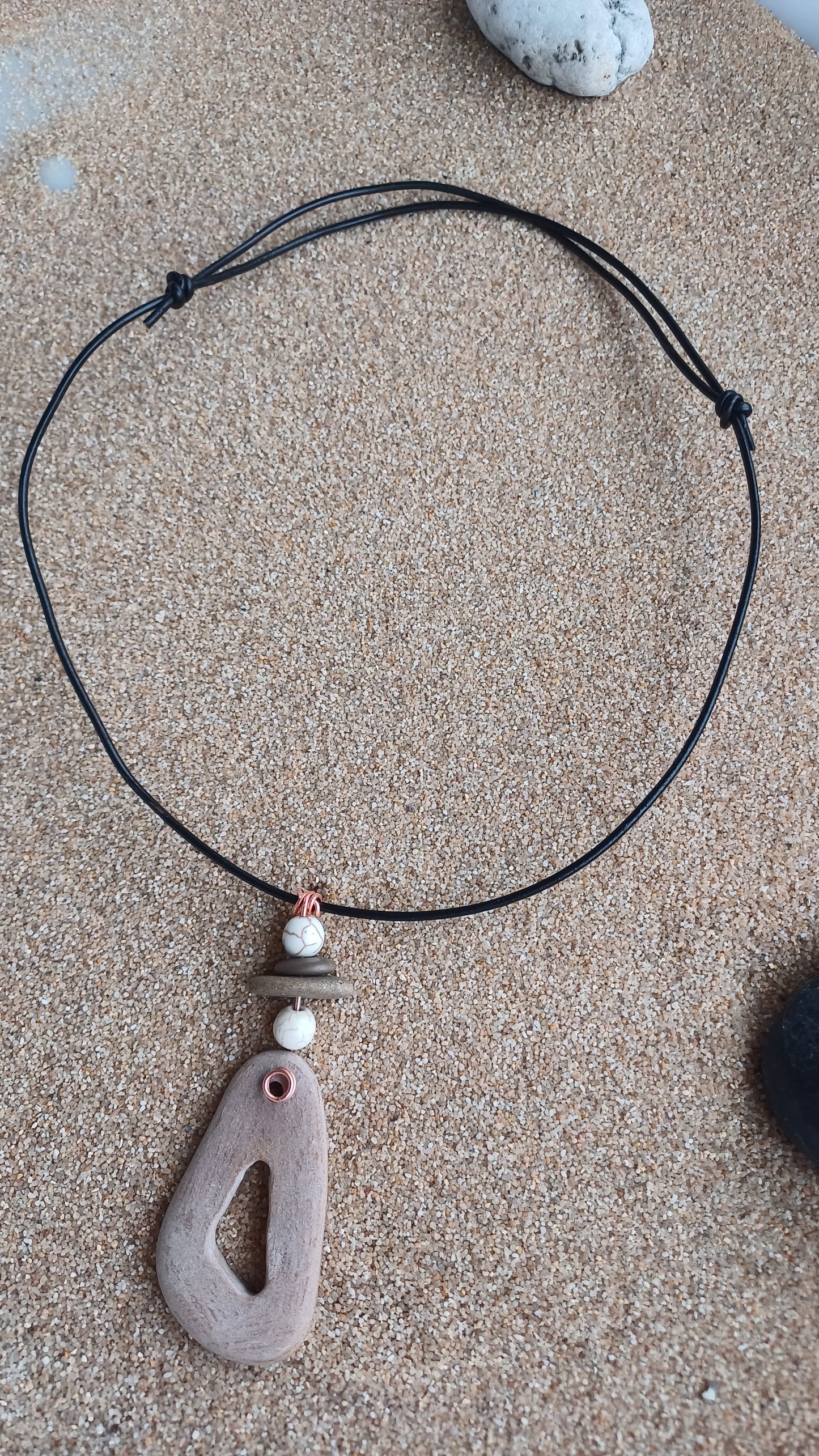 -Piedra de playa de 80mm. x 33mm tallada mano y con 2 howlitas en cuerda de piel de 66 cm.