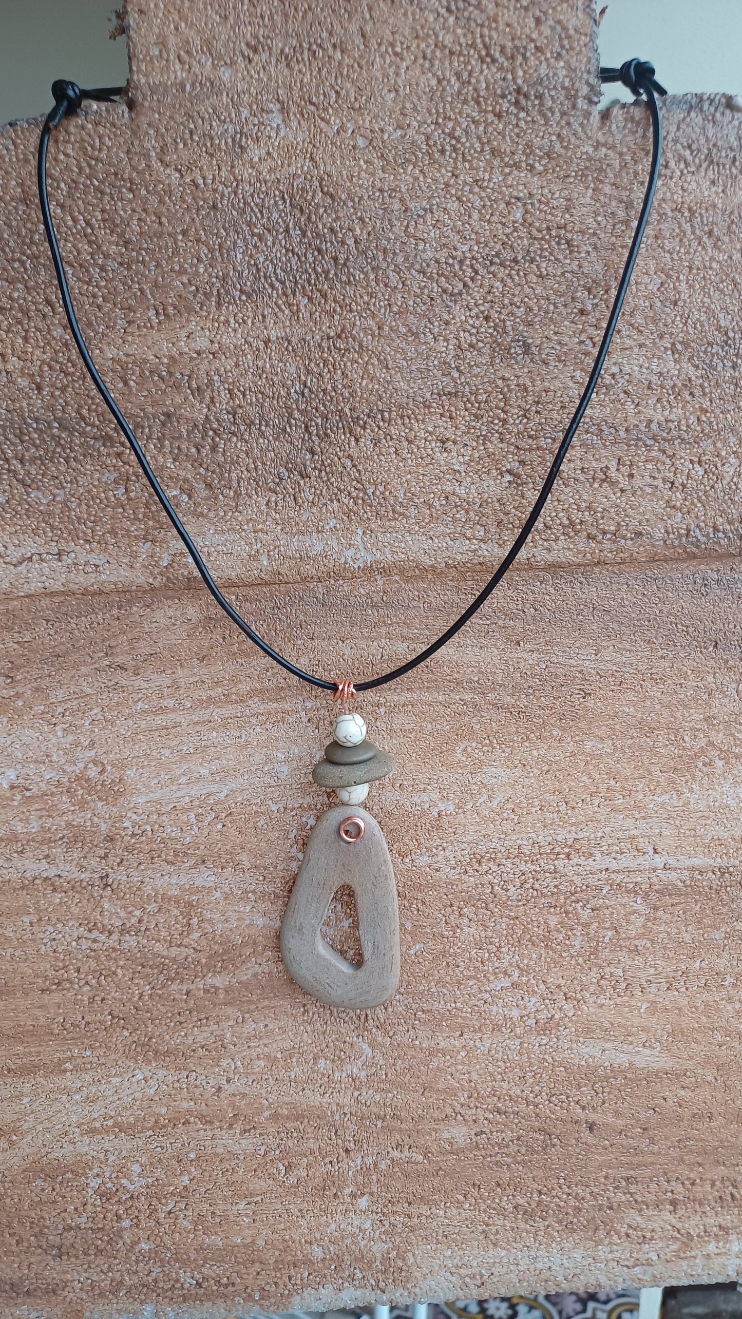 -80mm beach stone. x 33mm hand carved and with 2 howlites on a 66 cm leather rope.
