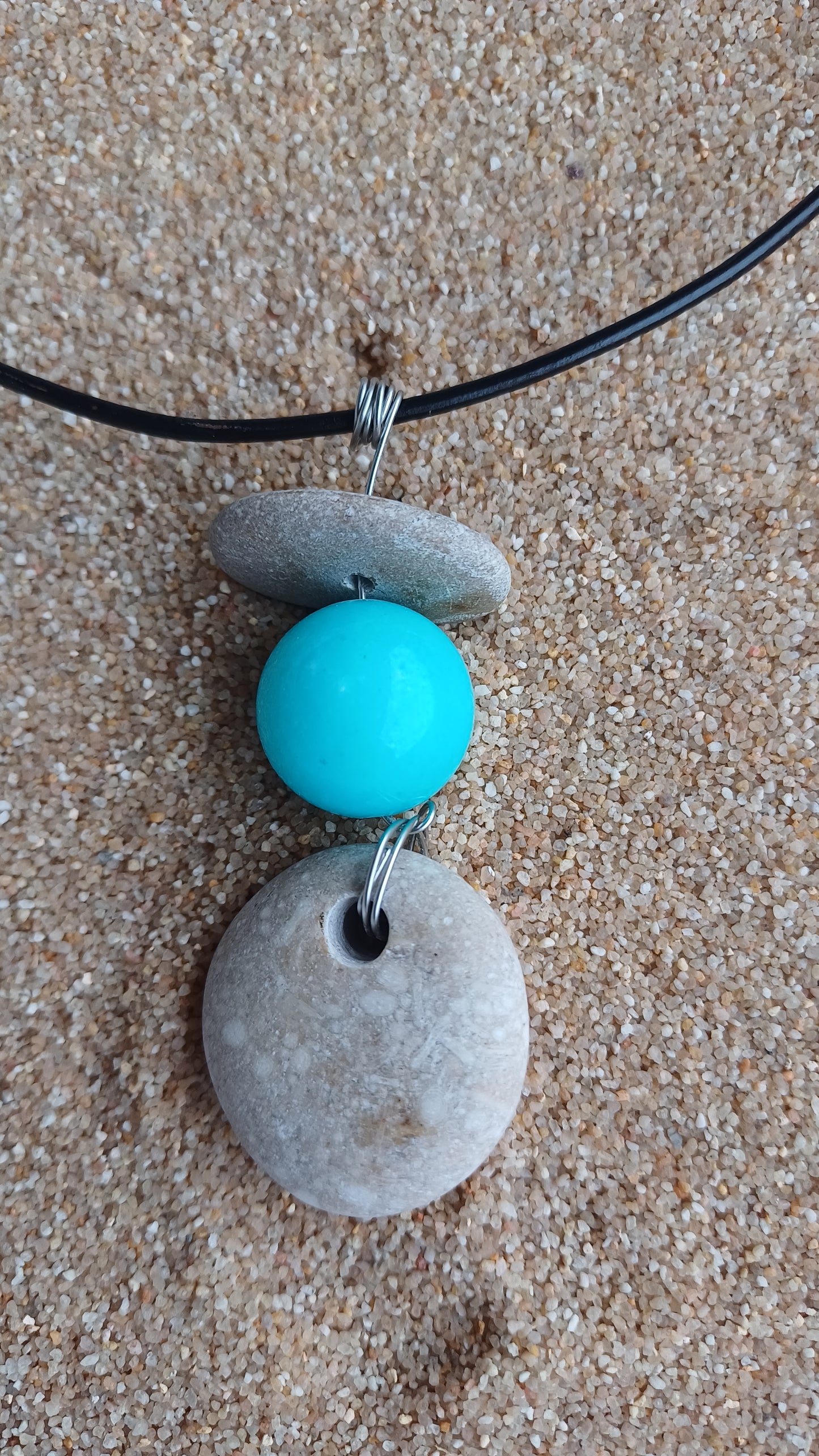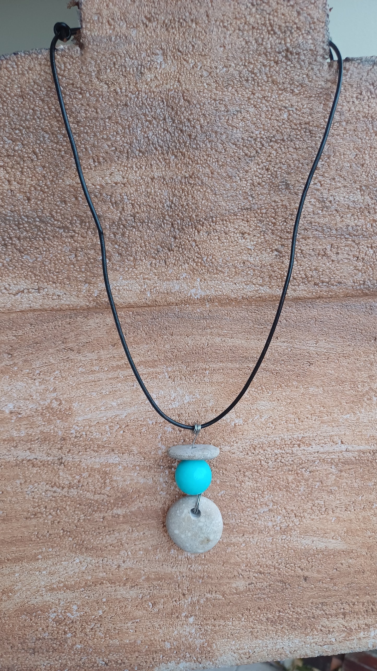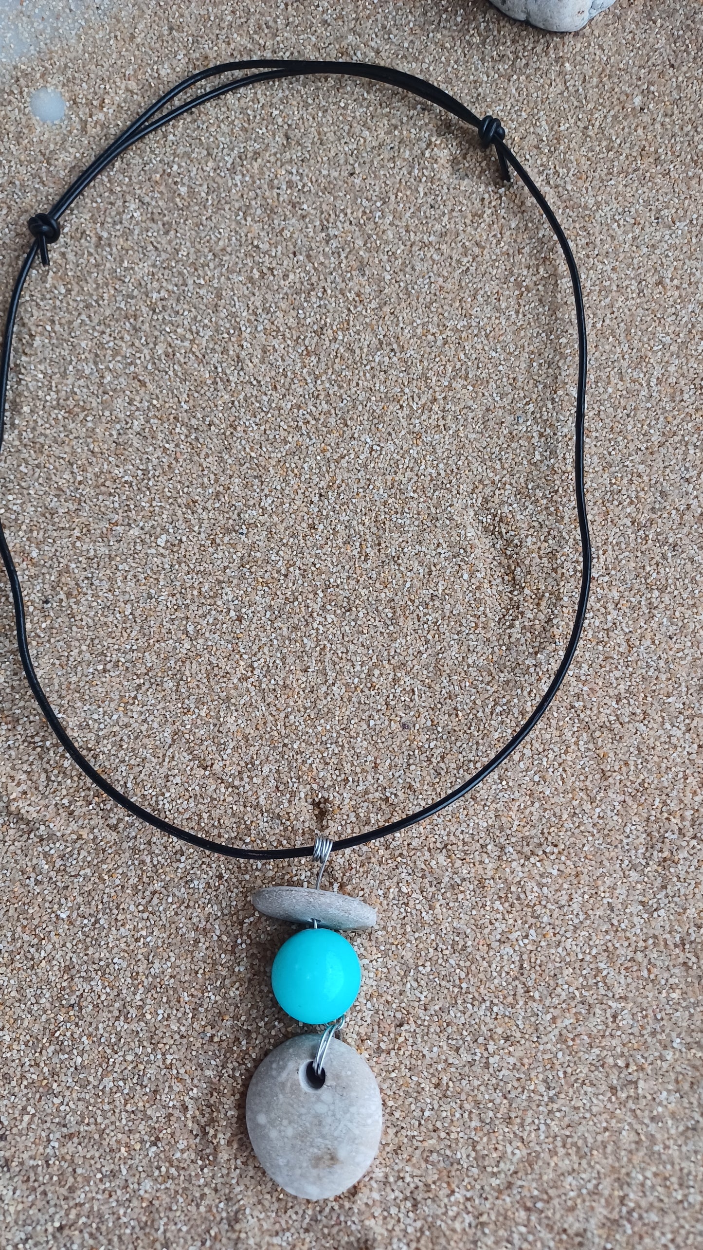-80mm beach stones. x 33mm with a turquoise glass ball on a 66 cm leather rope.