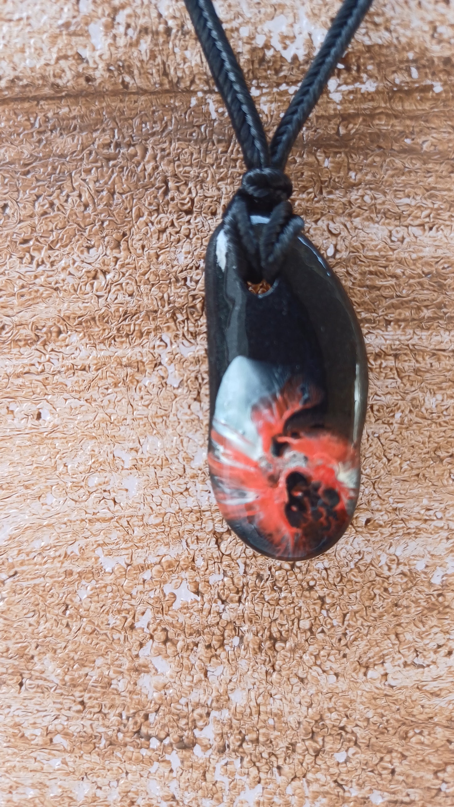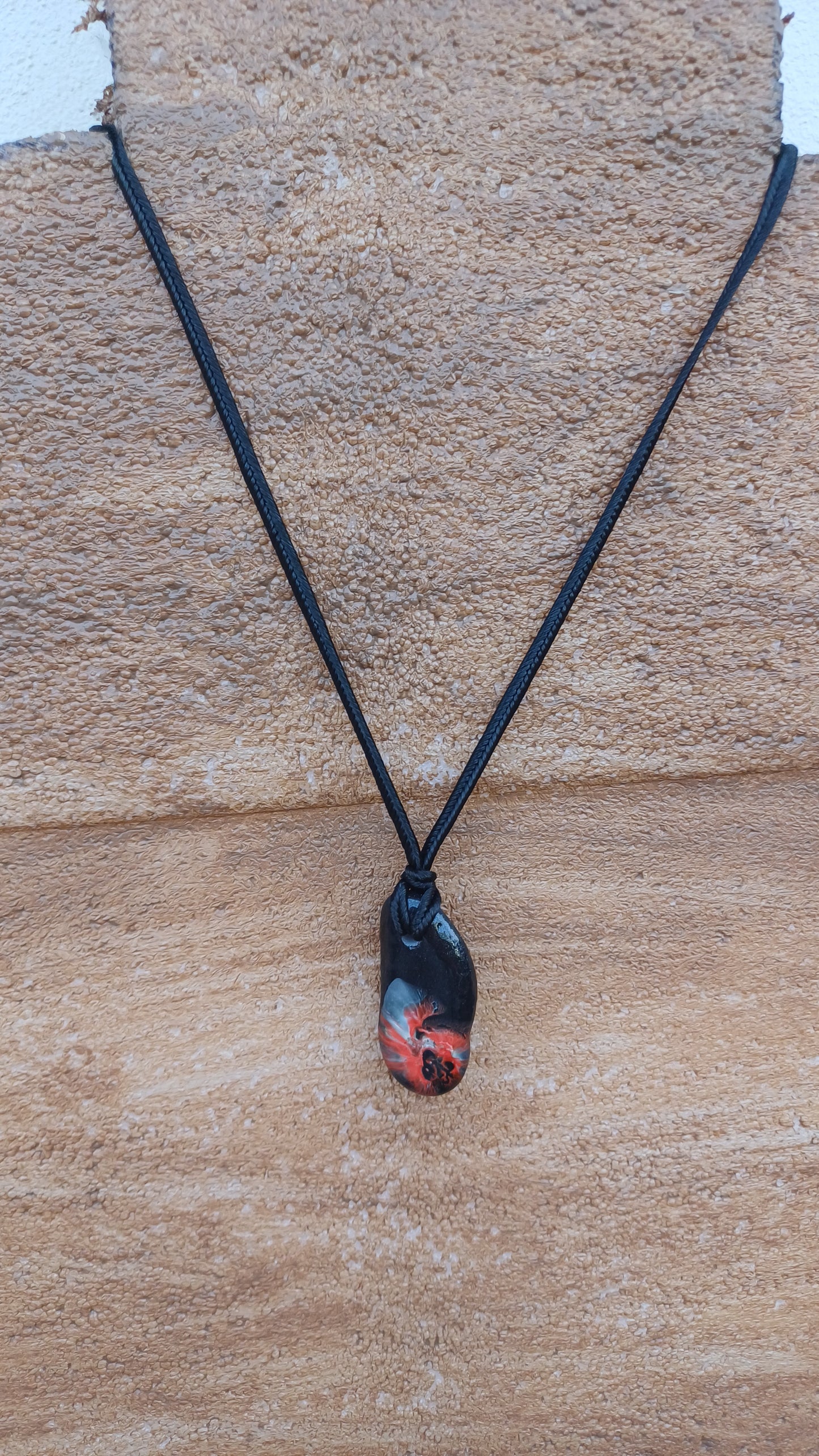 -Hand painted stone 40mm x 18mm. with 66 cm adjustable rope.