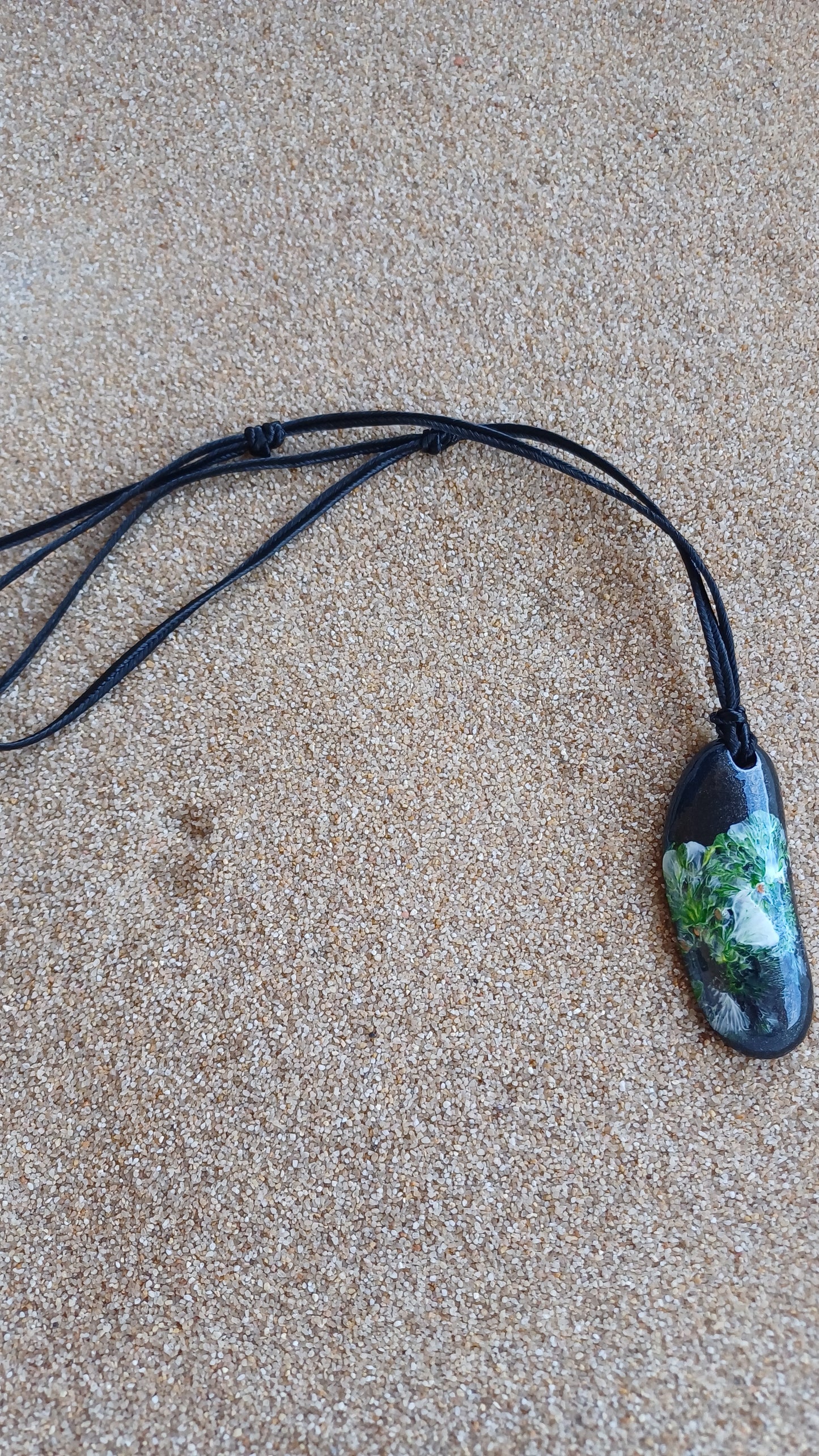 -Hand-painted beach stone measuring 55mm x 20mm and with a 66cm adjustable rope.