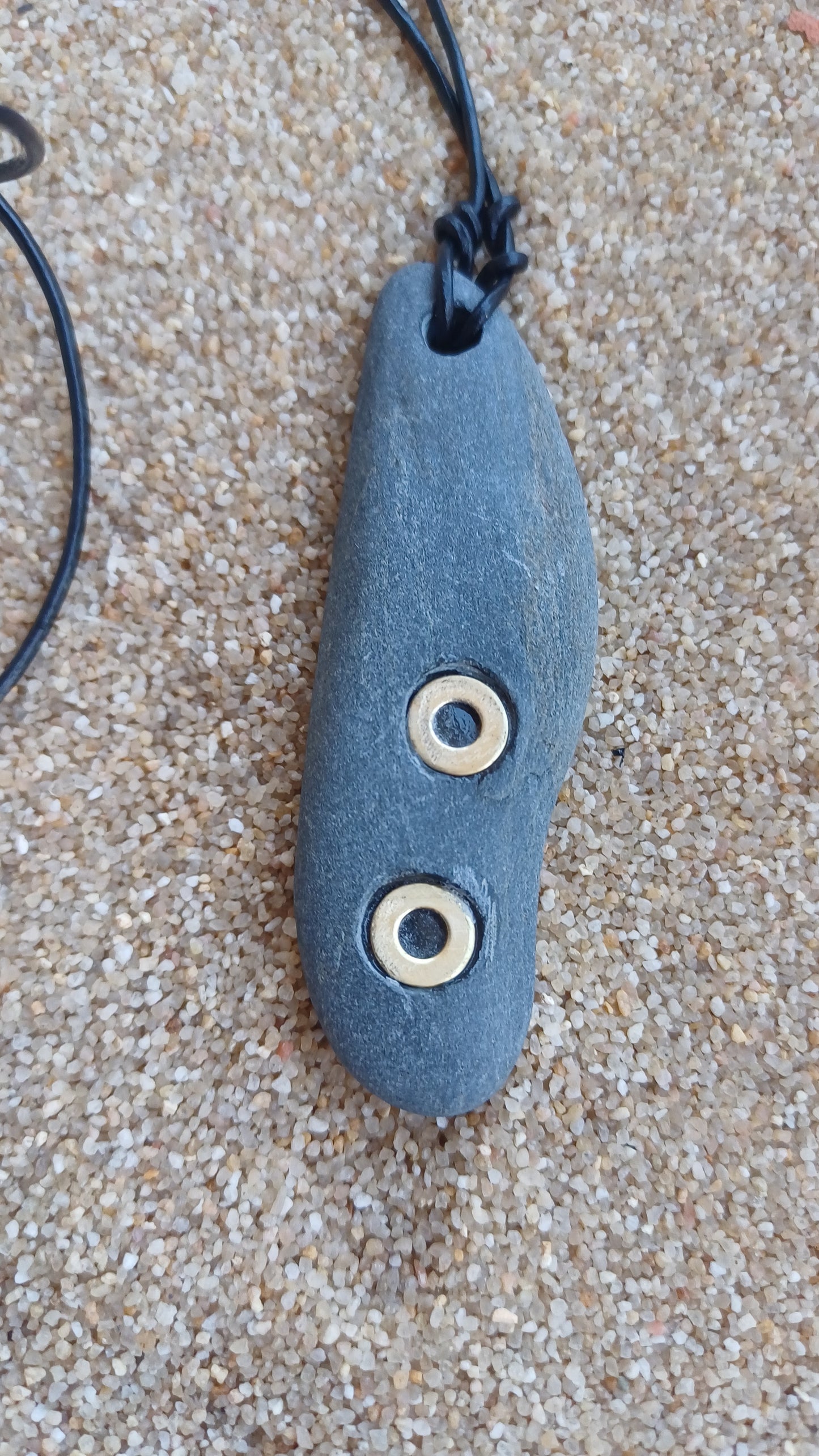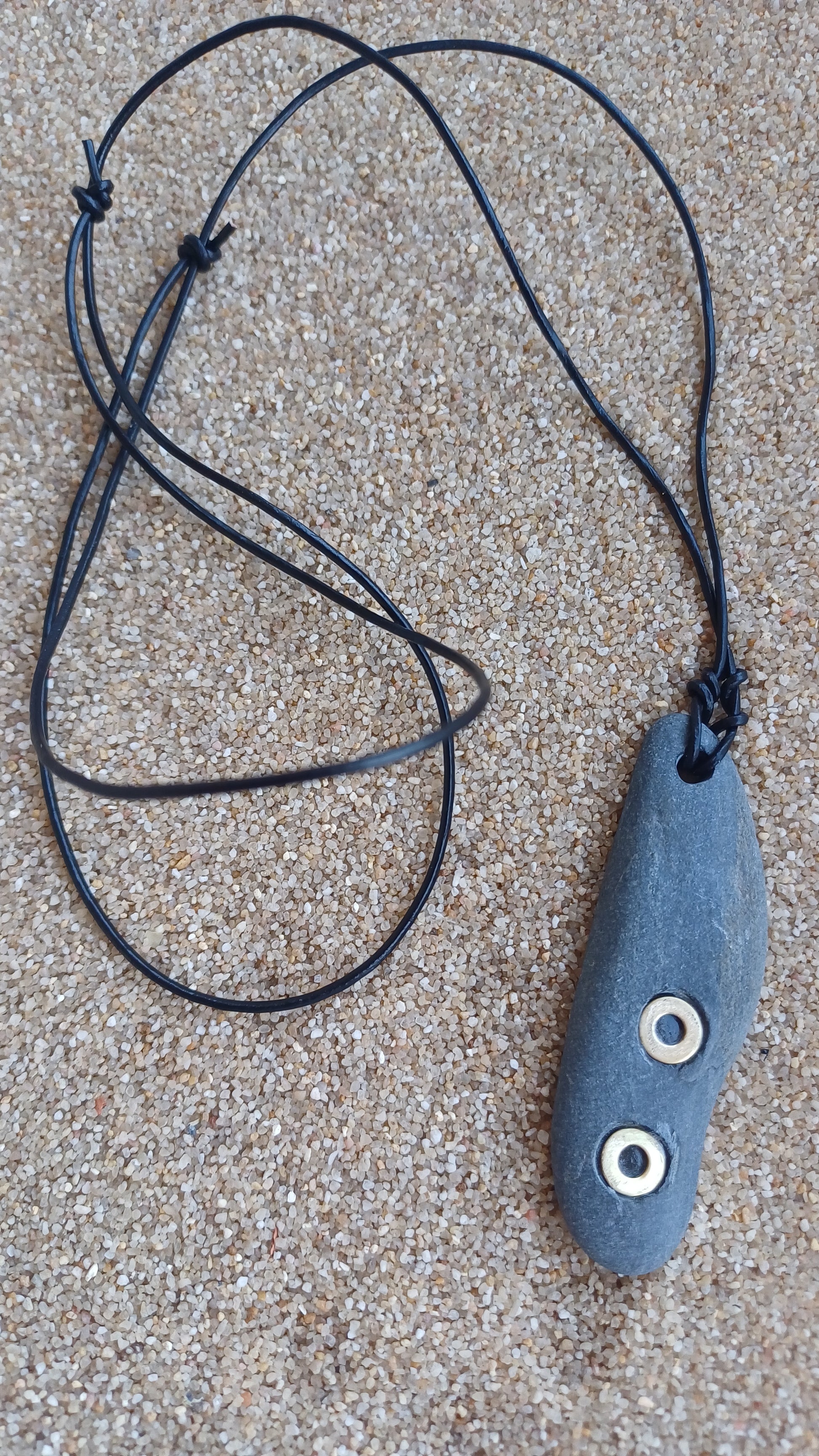 -62mm x 22mm beach stone with brass hoops on 66cm adjustable leather rope.