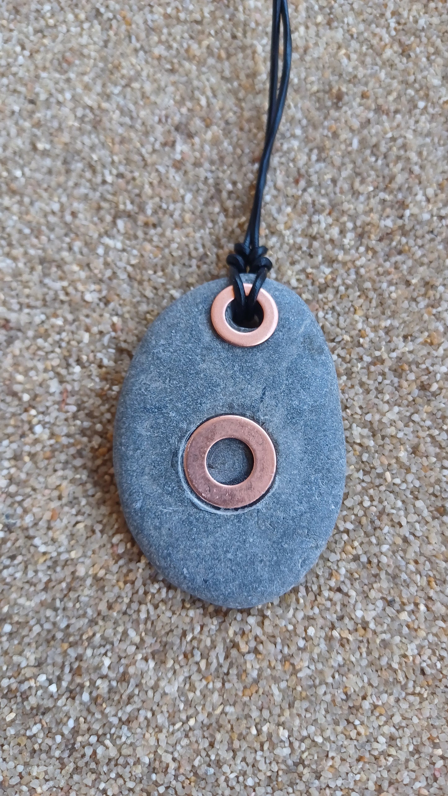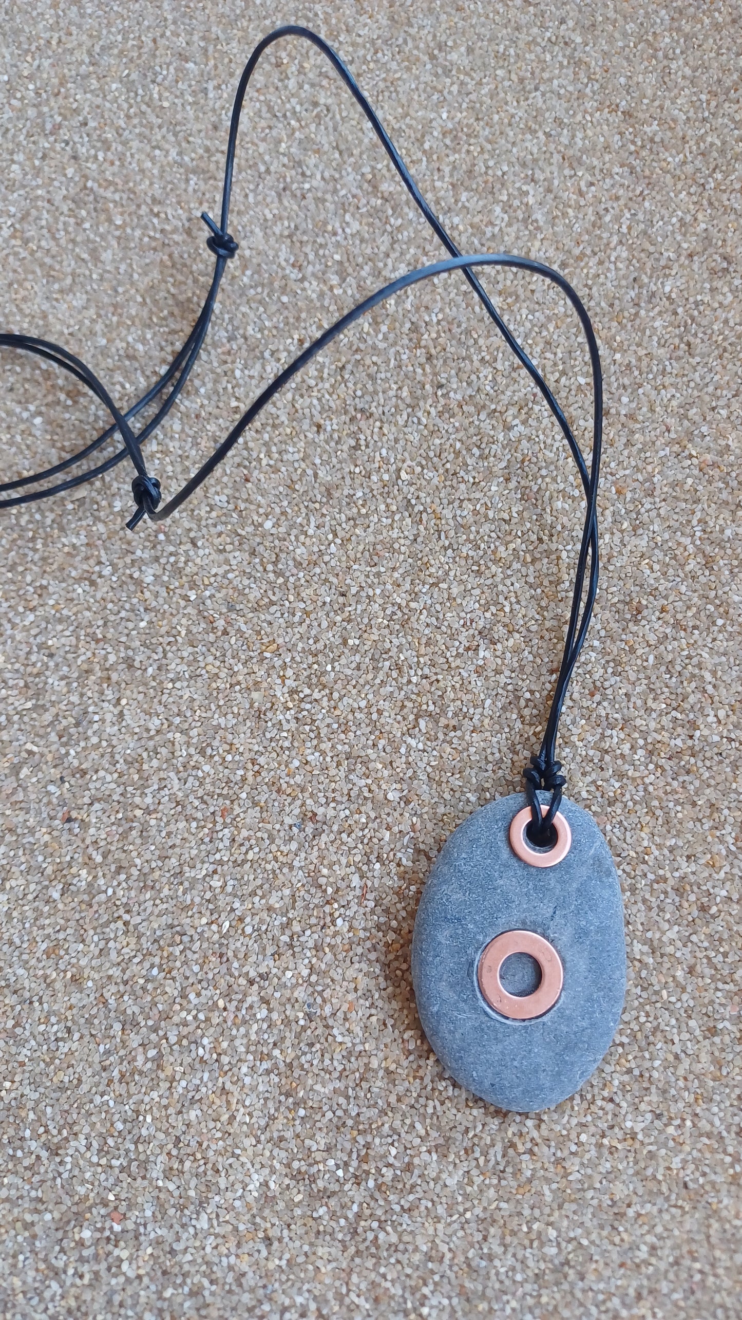 -46mm x 32mm beach stone with copper hoops on 66cm adjustable leather rope.