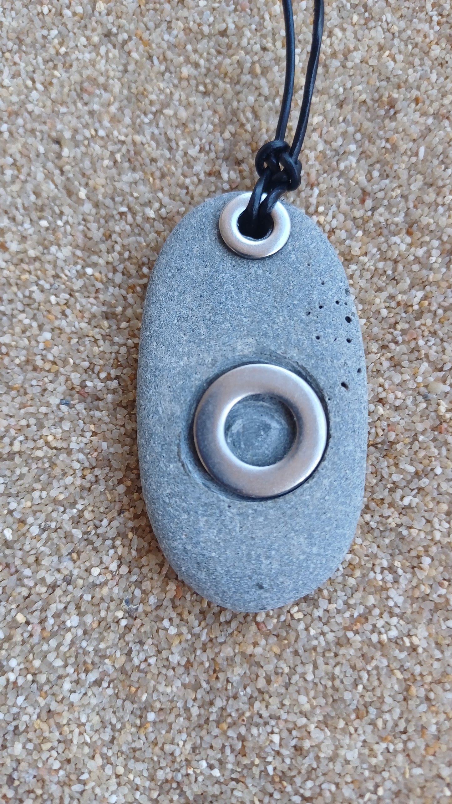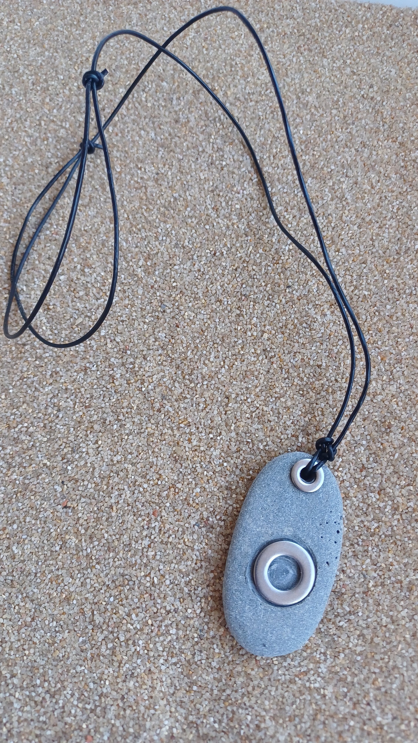 -55mm x 30mm beach stone with stainless steel hoops on 66cm adjustable leather rope.