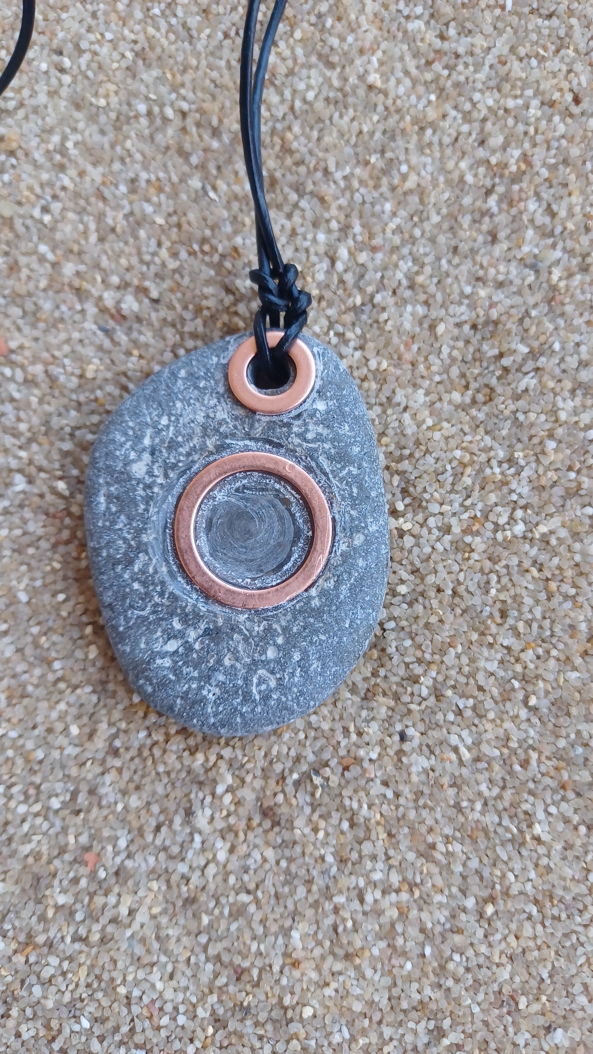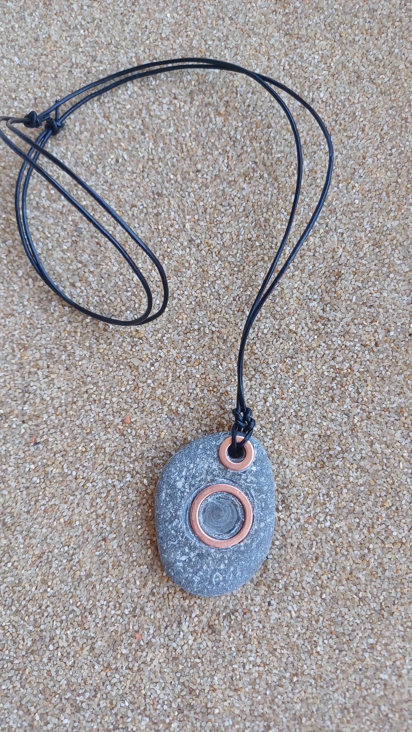 -48mm x 32mm beach stone with copper hoops on 66cm adjustable leather rope.