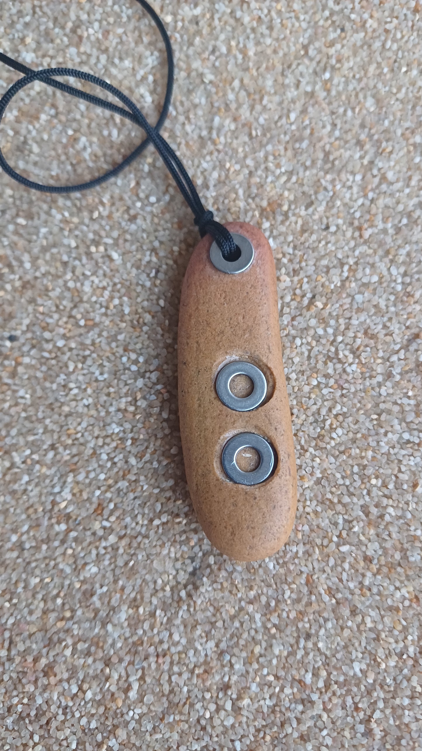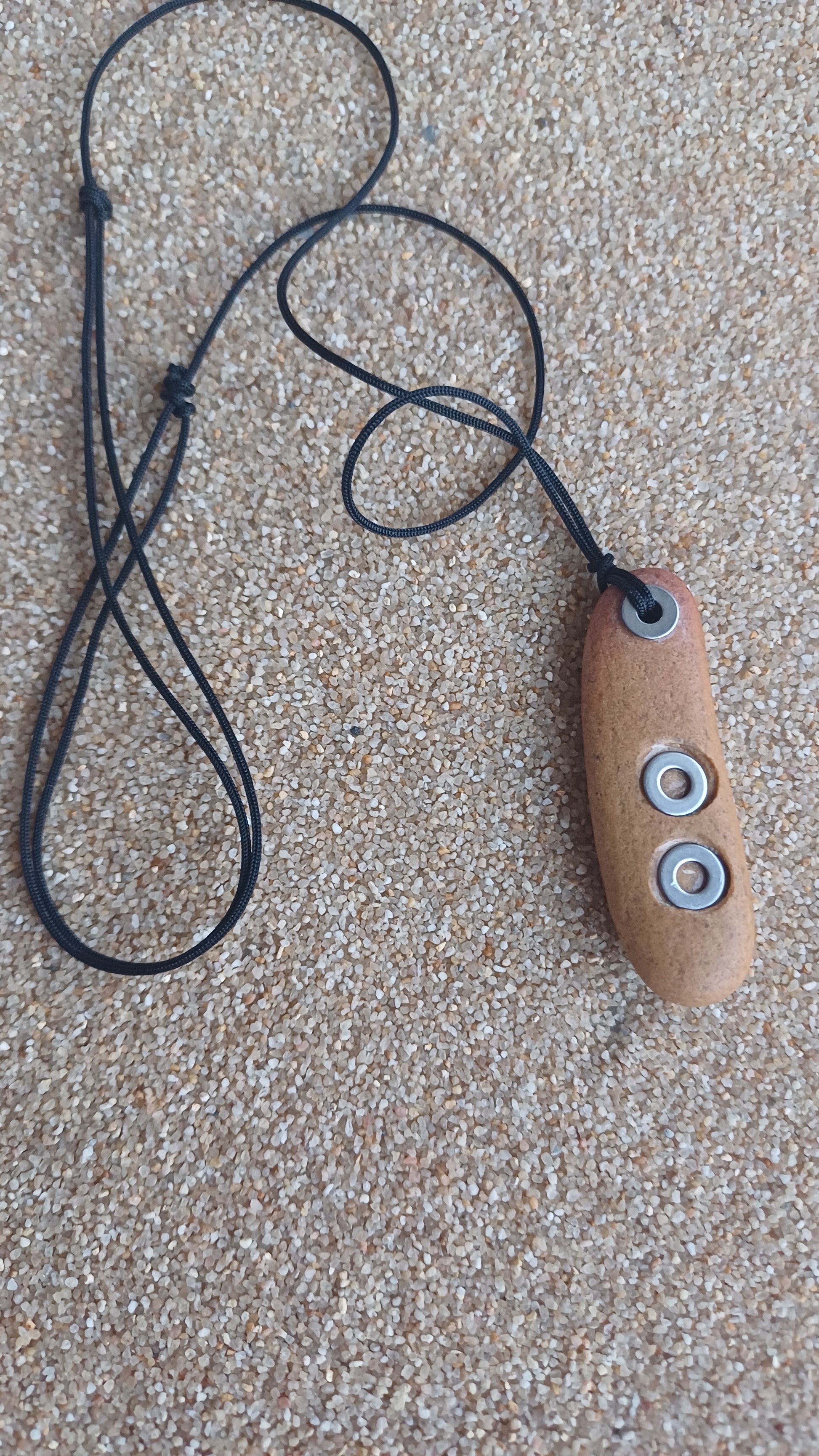 -Piedra de playa de 60mm x 15mm con aros de acero inoxidable y cuerda adjustable de 66cm.