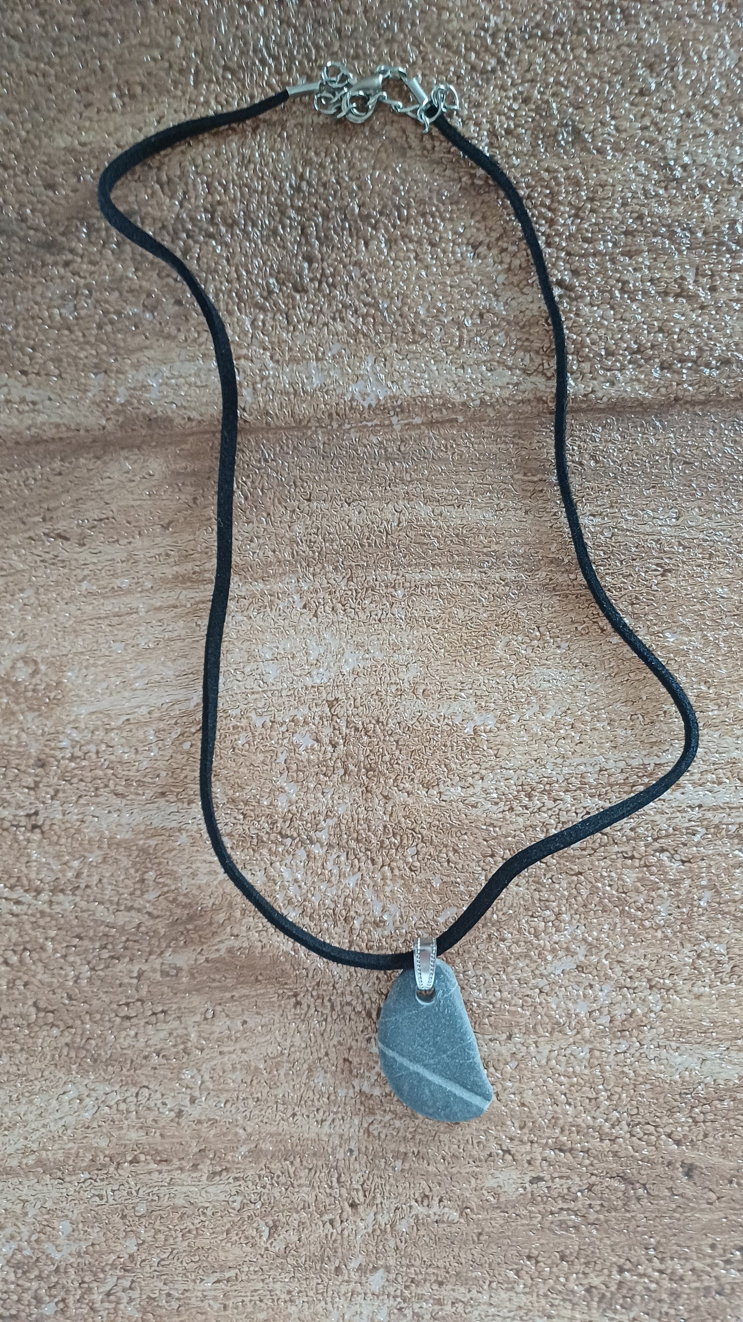 Piedra de playa con cierre de plata 30mm x 20mm viene con cuerda de piel negro de 45 cm.