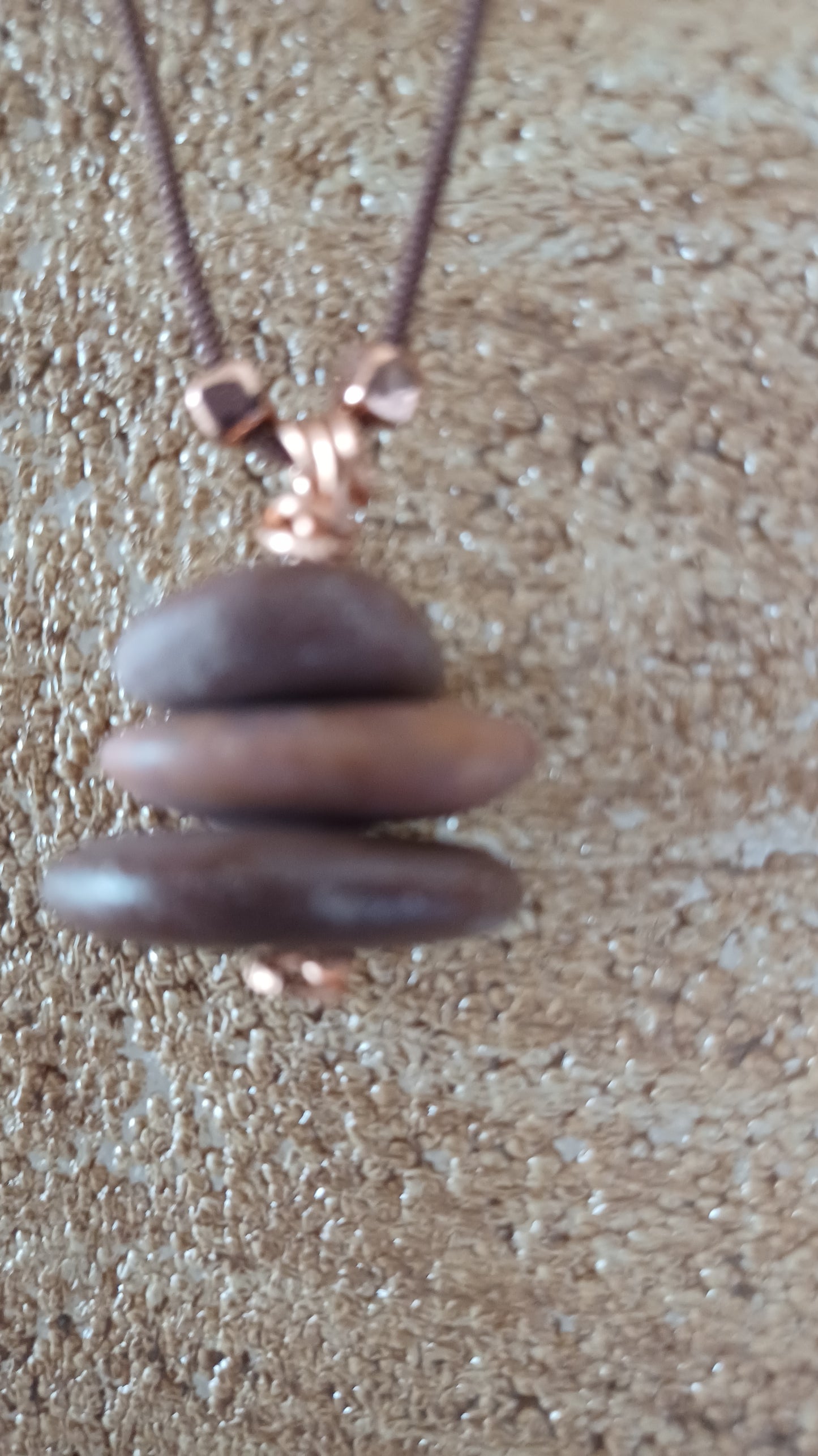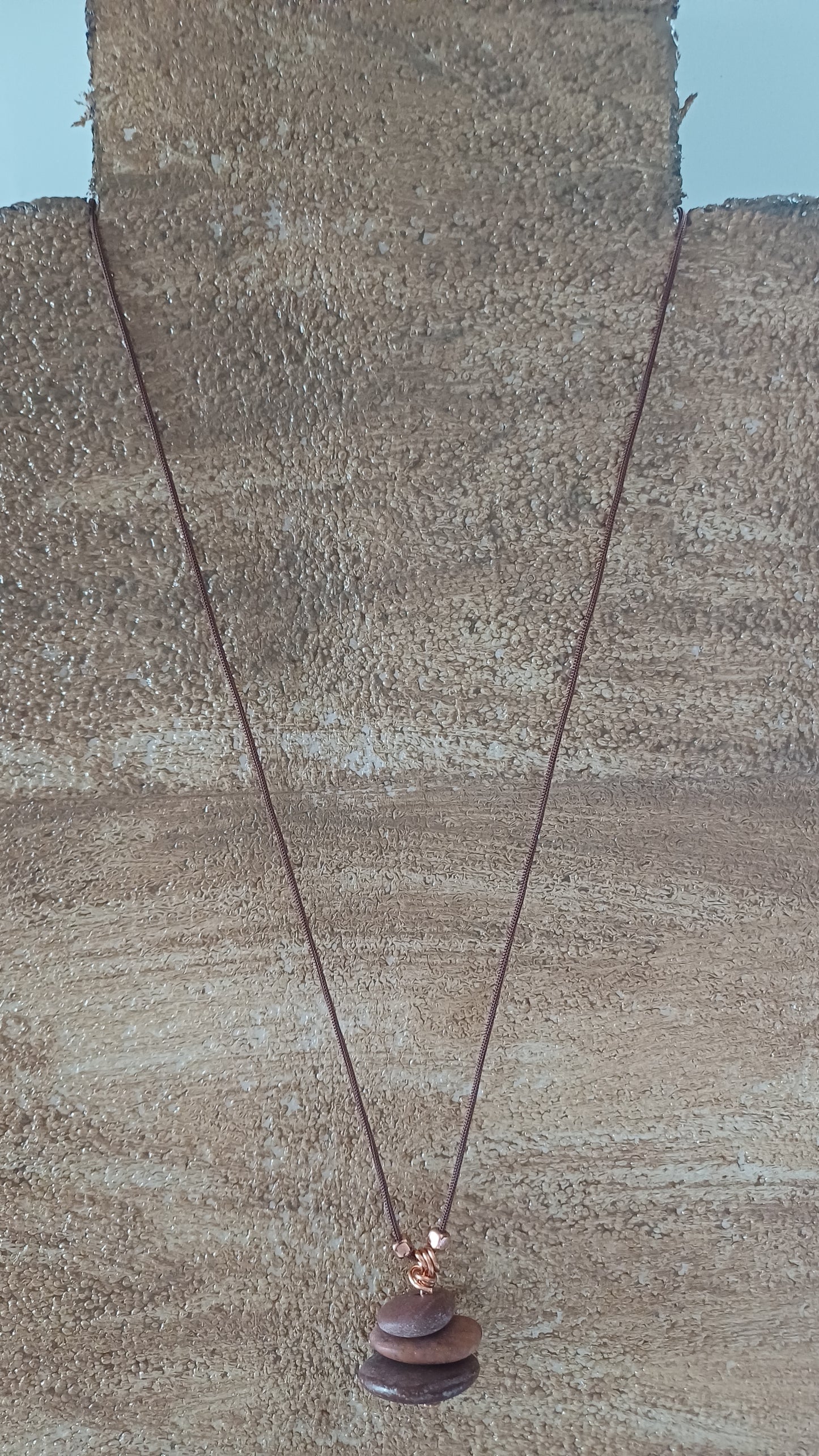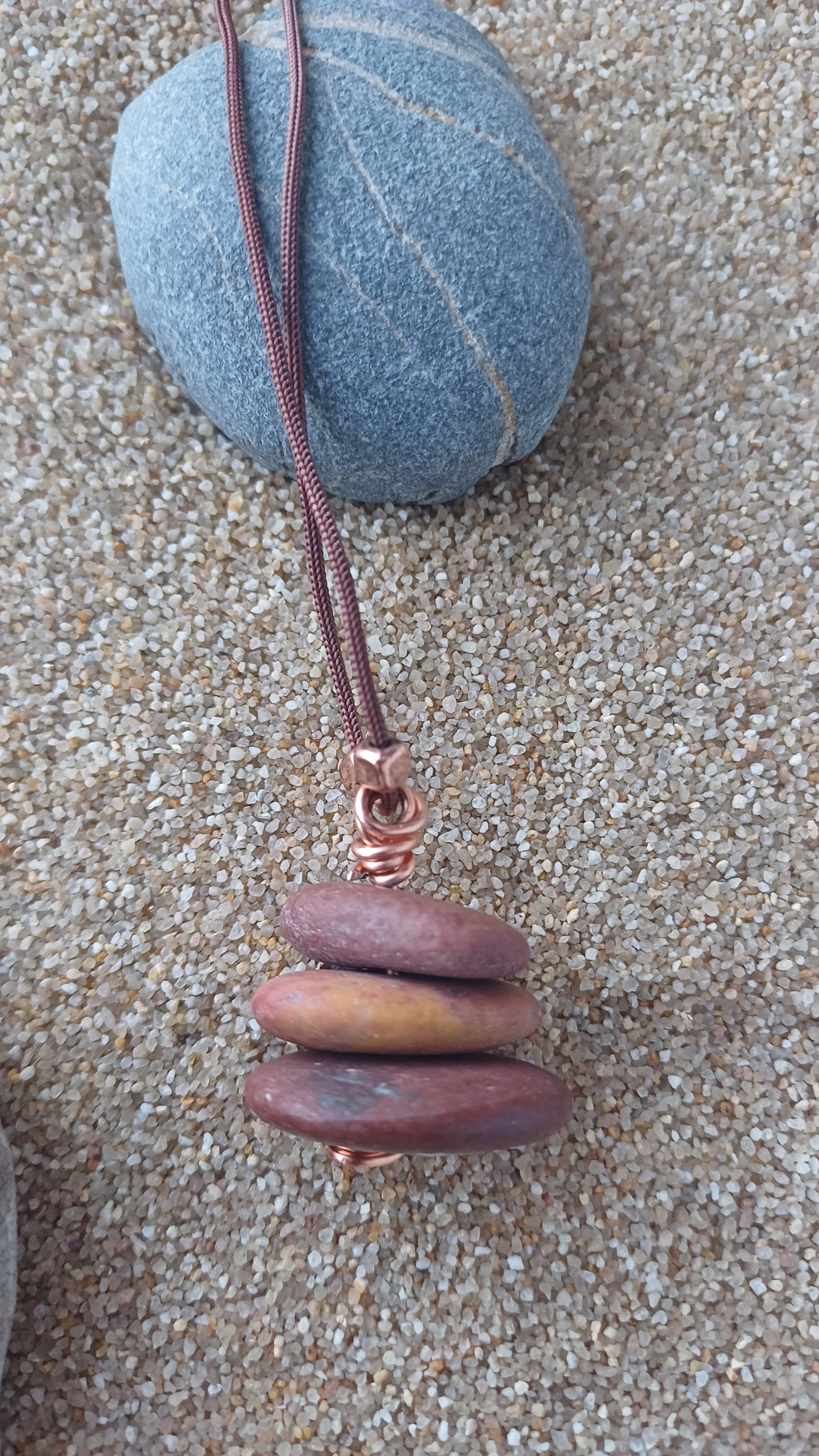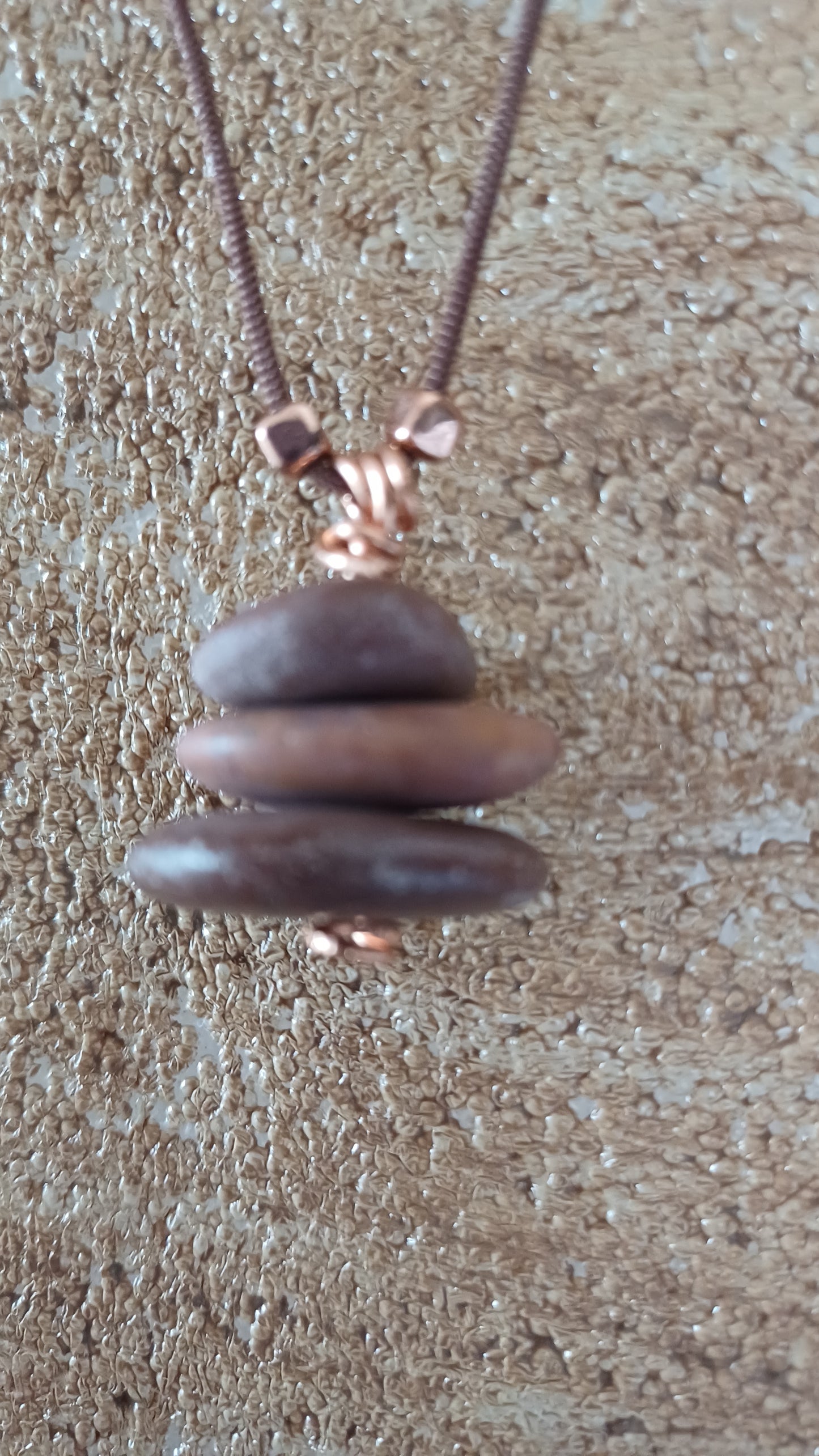 -Collar con 3 piedras de playa y cobre 30mm. x 20mm y cuerda de 70cm.