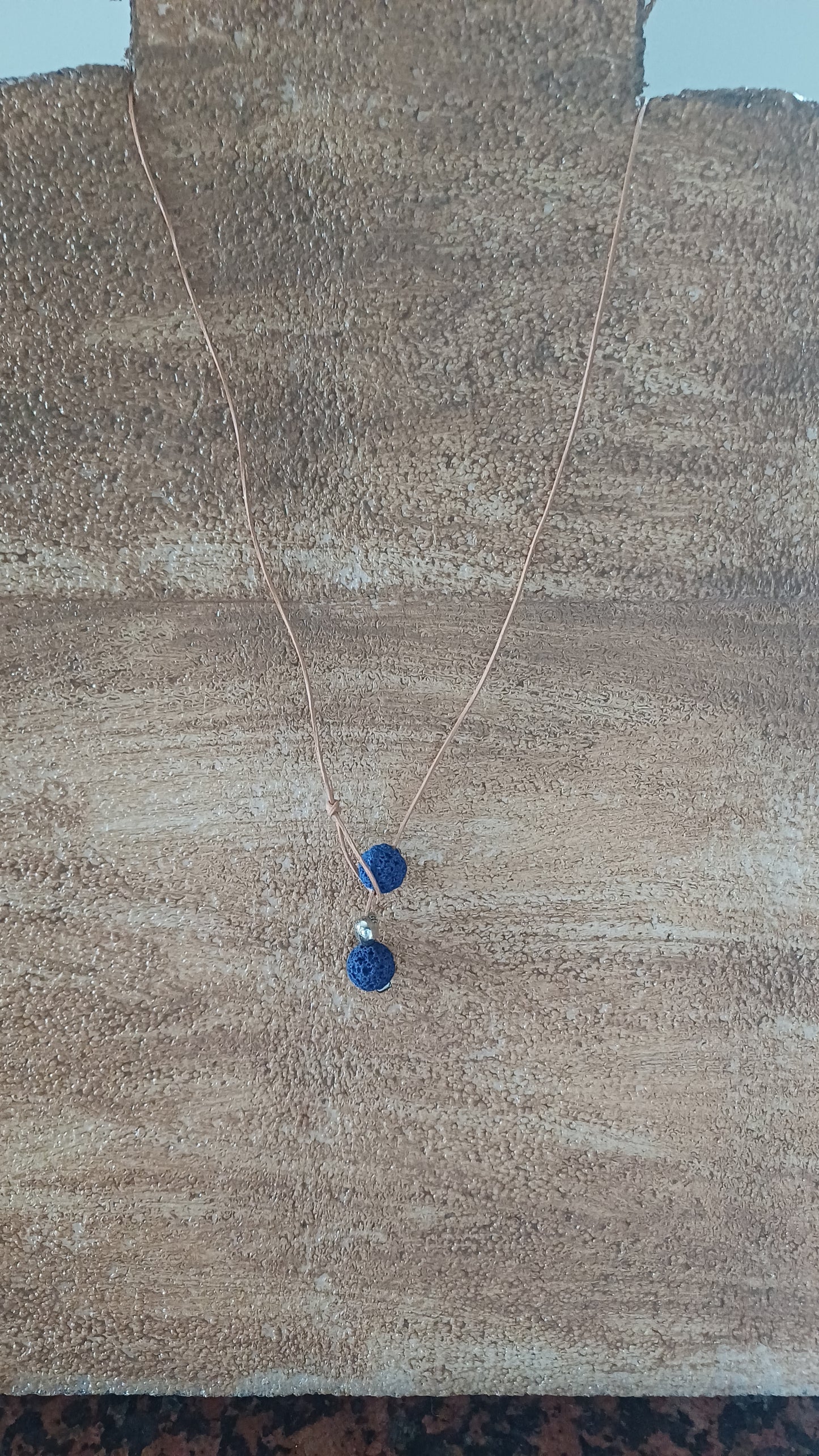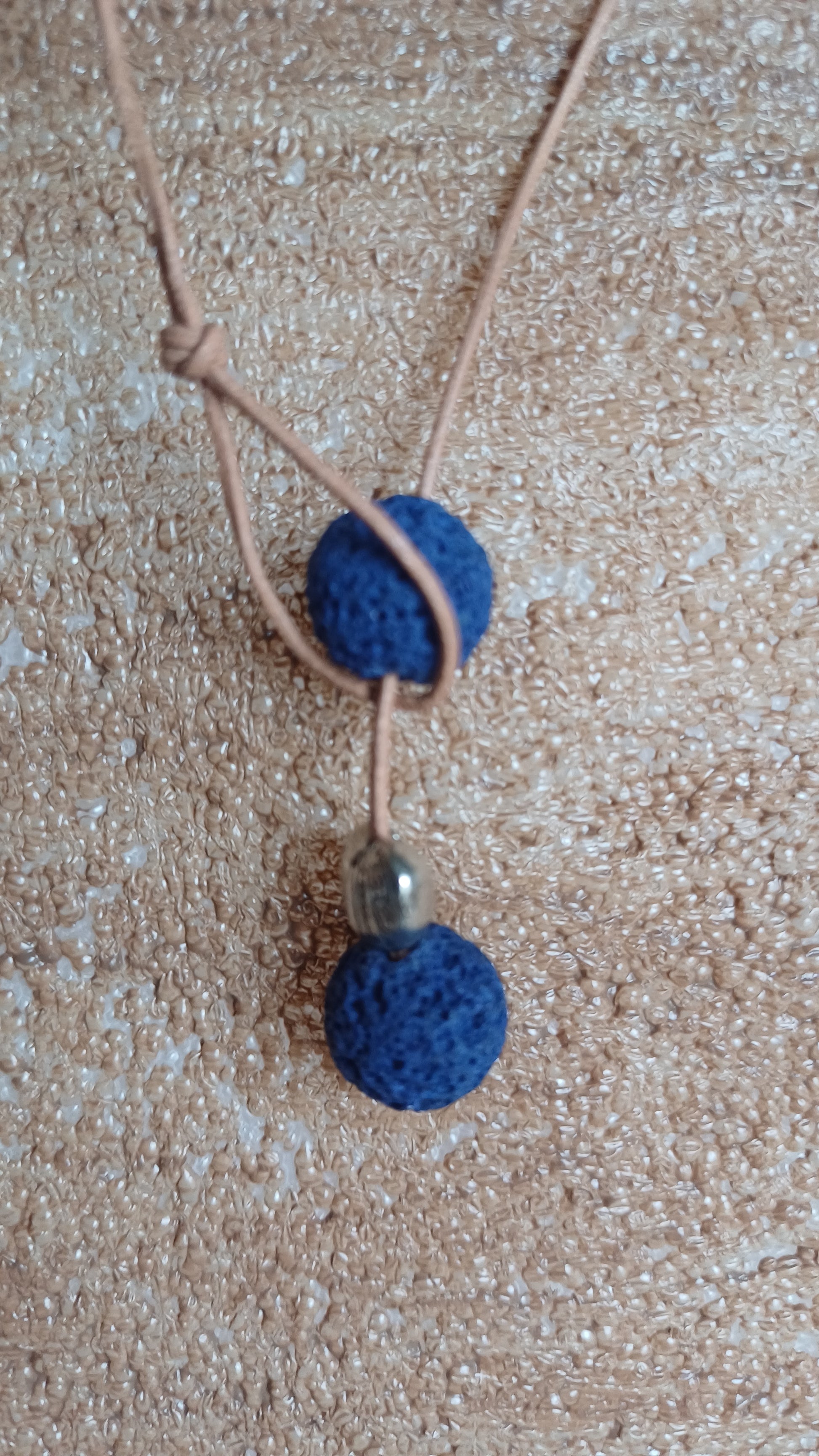 -Collar de lava volcanica tenida de azul y acero de 30 mm. con cuerda de piel 52 cm.